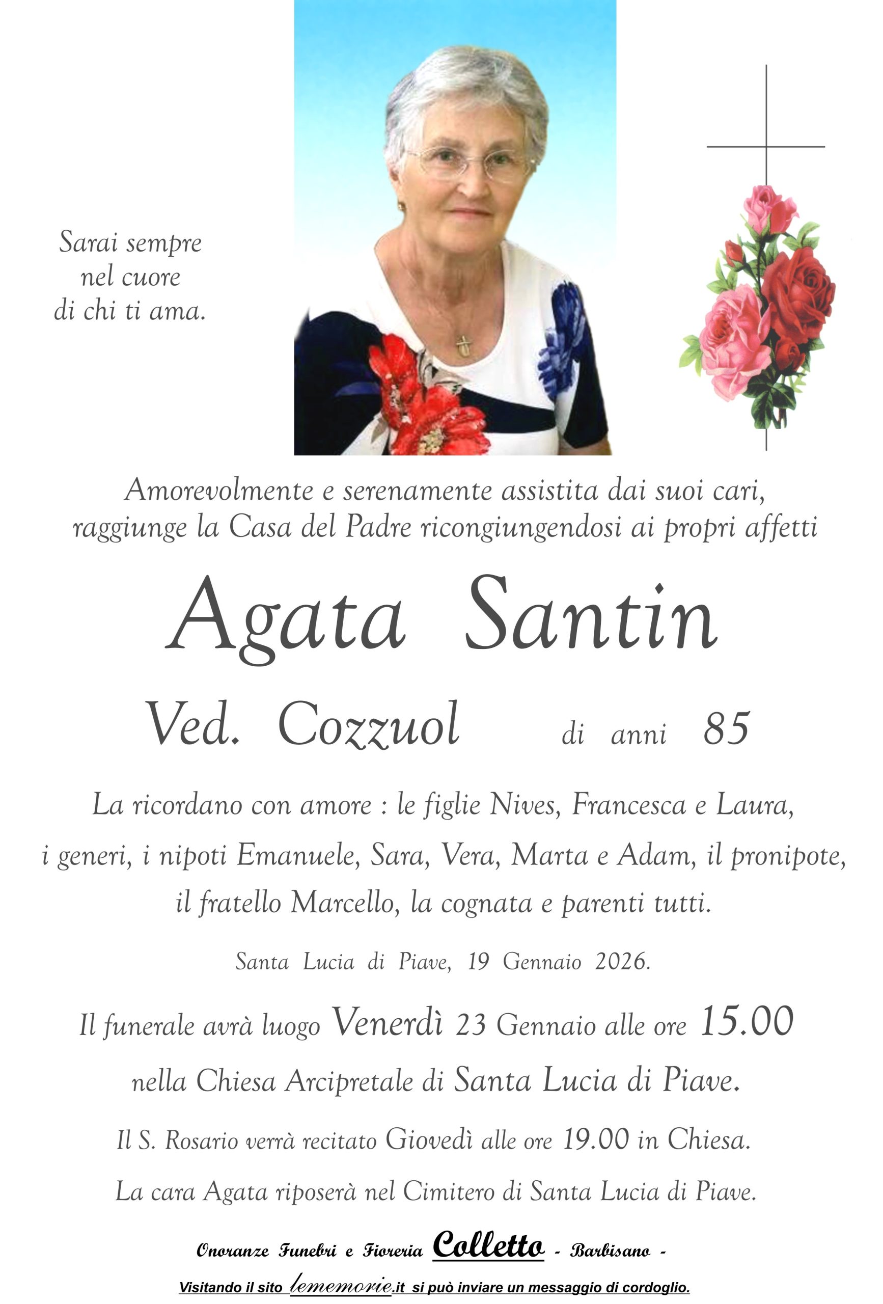 Il funerale avrà luogo Venerdì 23 Gennaio alle ore 15.00 nella Chiesa Arcipretale di Santa Lucia di Piave.