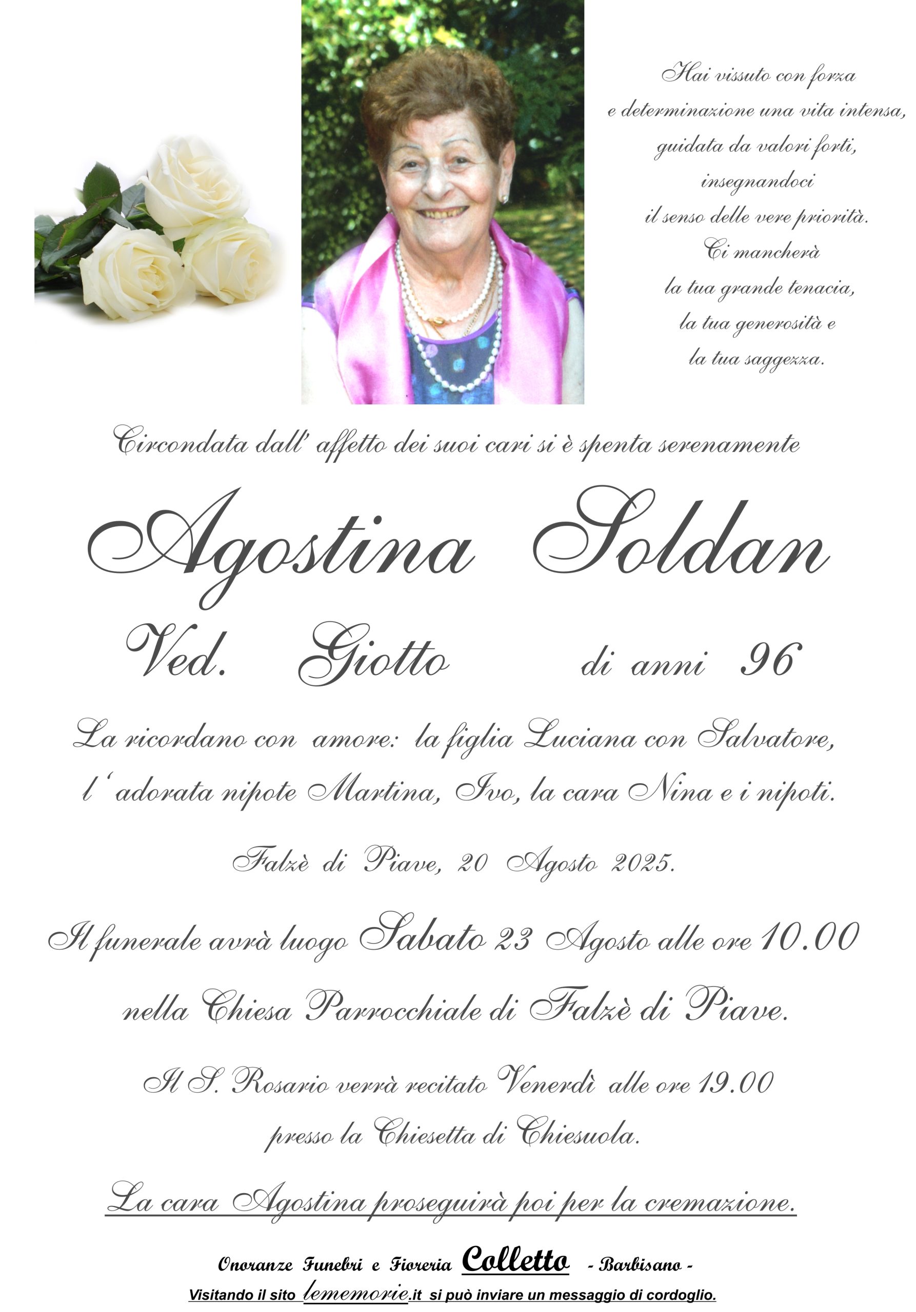 Il funerale avrà luogo Sabato 23 Agosto alle one 10.00 nella Chiesa Parrocchiale di Falzè di Piave.