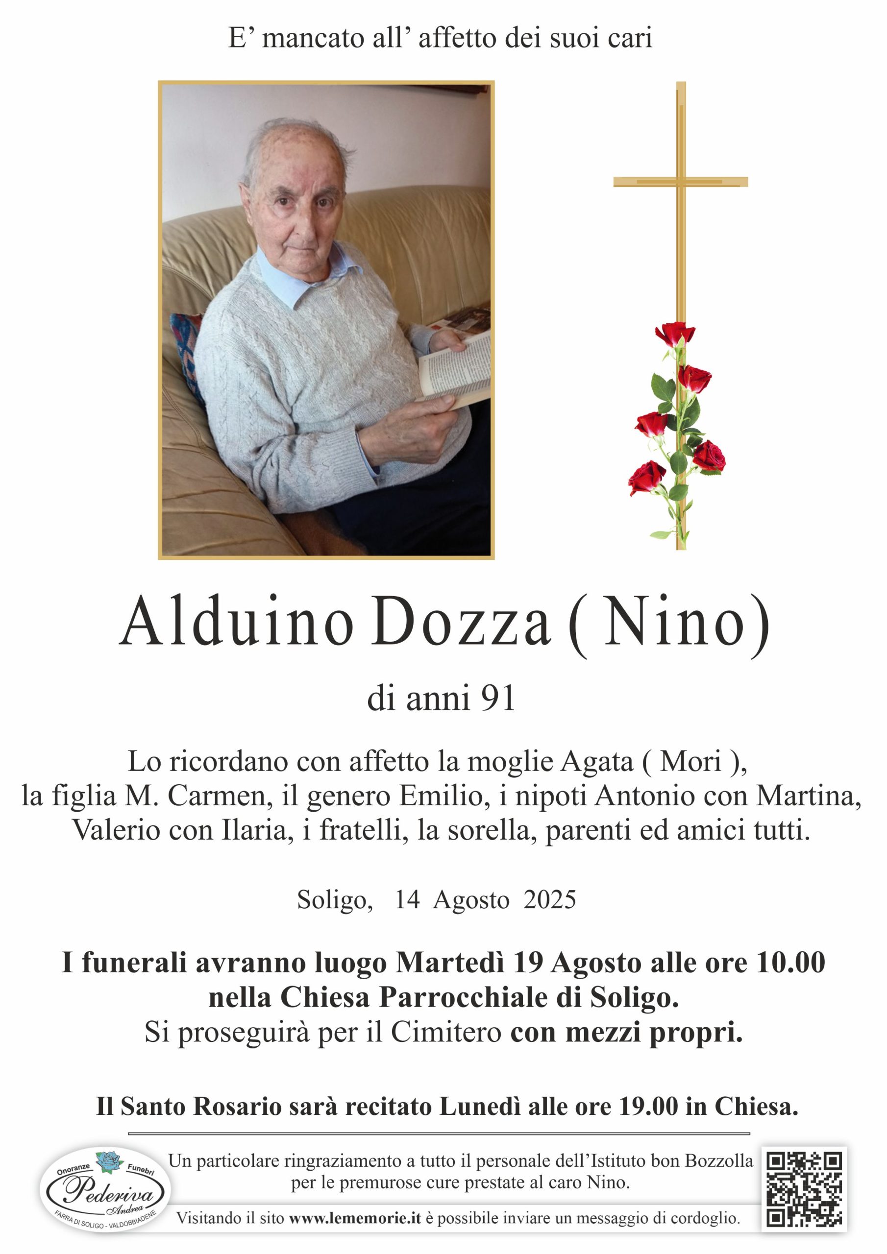 I funerali avranno luogo Martedì 19 Agosto alle ore 10.00 nella Chiesa Parrocchiale di Soligo.