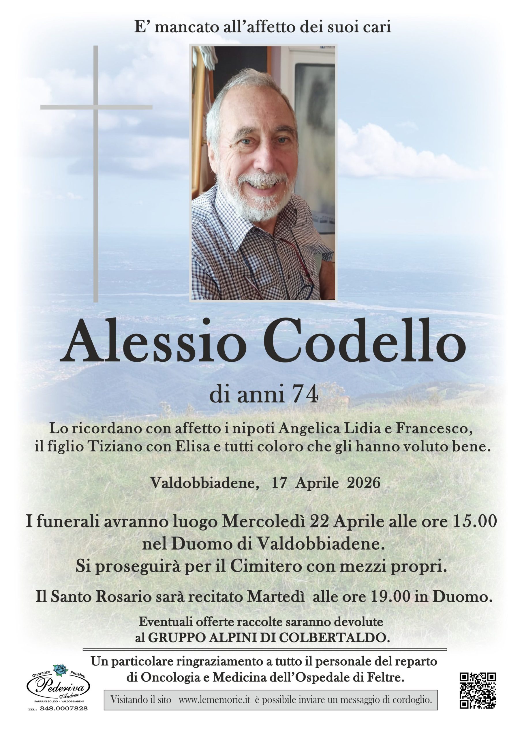 I funerali avranno luogo Mercoledì 22 Aprile alle ore 15.00 nel Duomo di Valdobbiadene.
