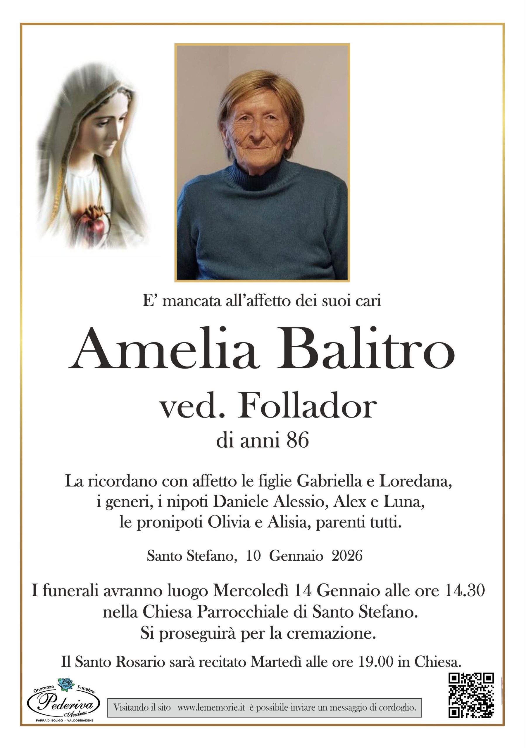 I funerali avranno luogo Mercoledì 14 Gennaio alle ore 14.30 nella Chiesa Parrocchiale di Santo Stefano.