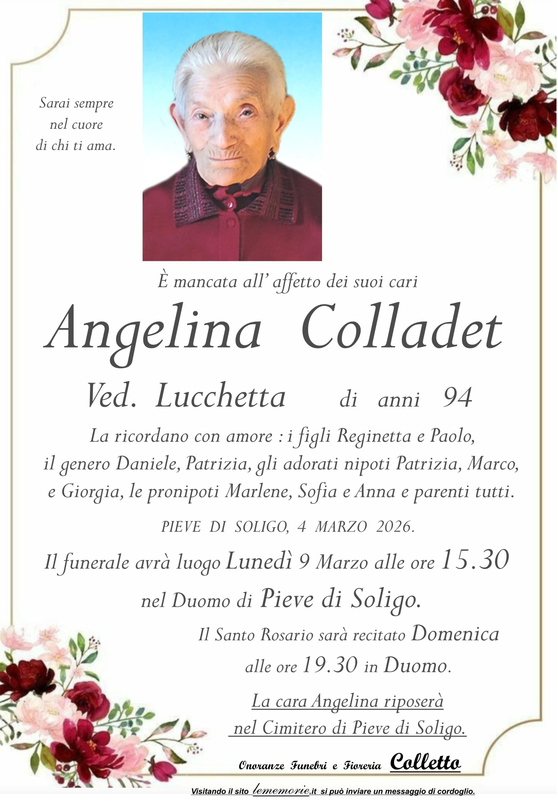Il funerale avrà luogo Lunedì 9 Marzo alle ore 15.30 nel Duomo di Pieve di Soligo.
