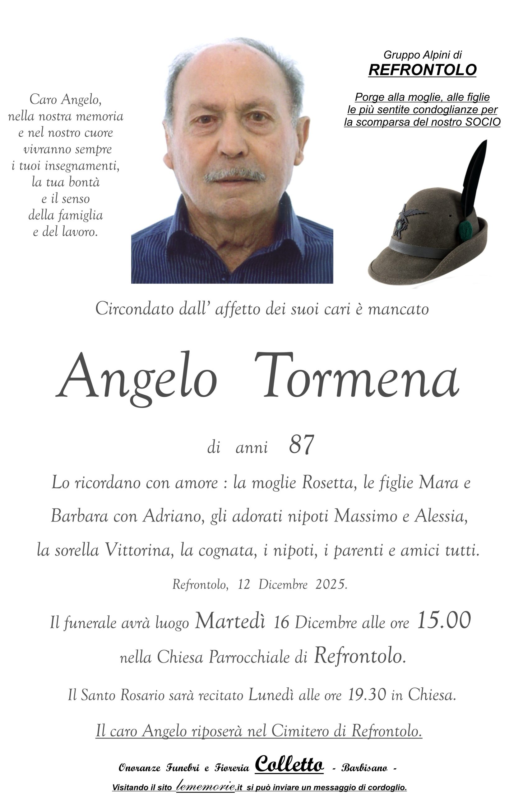 Il funerale avrà luogo Martedì 16 Dicembre alle ore 15.00 nella Chiesa Parrocchiale di Refrontolo.