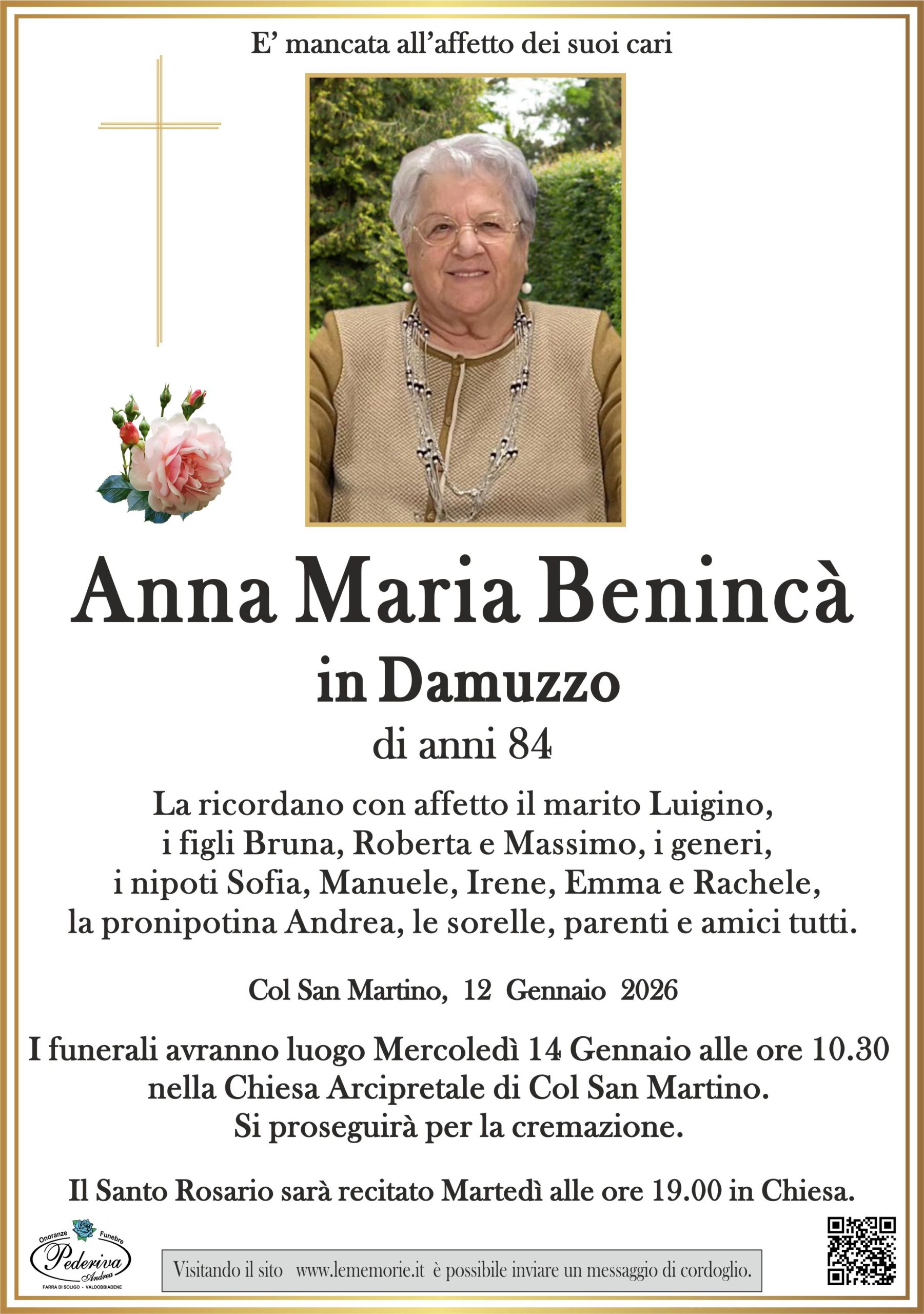 I funerali avranno luogo Mercoledì 14 Gennaio alle ore 10.30 nella Chiesa Arcipretale di Col San Martino.