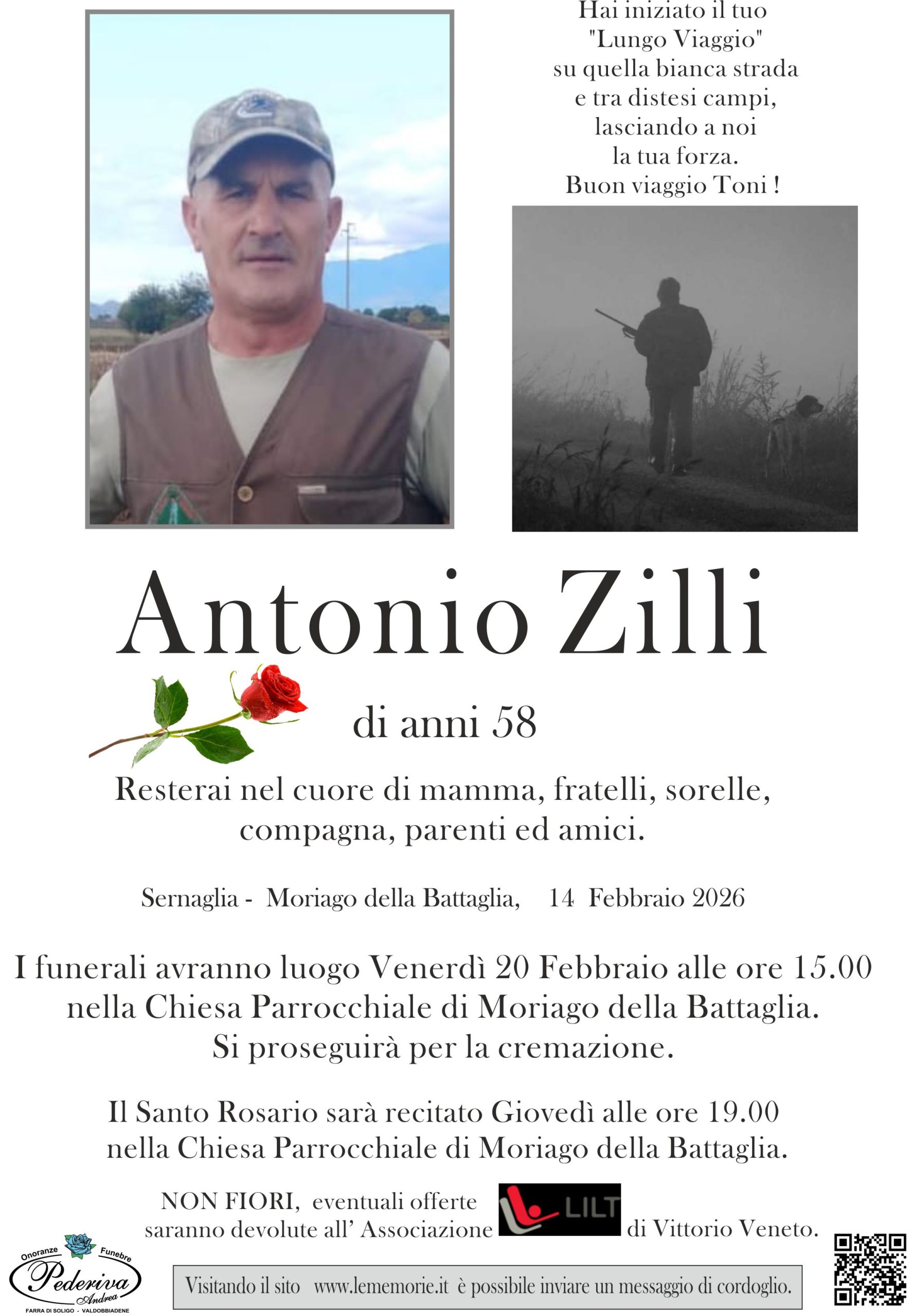 I funerali avranno luogo Venerdì 20 Febbraio alle ore 15.00 nella Chiesa Parrocchiale di Moriago della Battaglia.