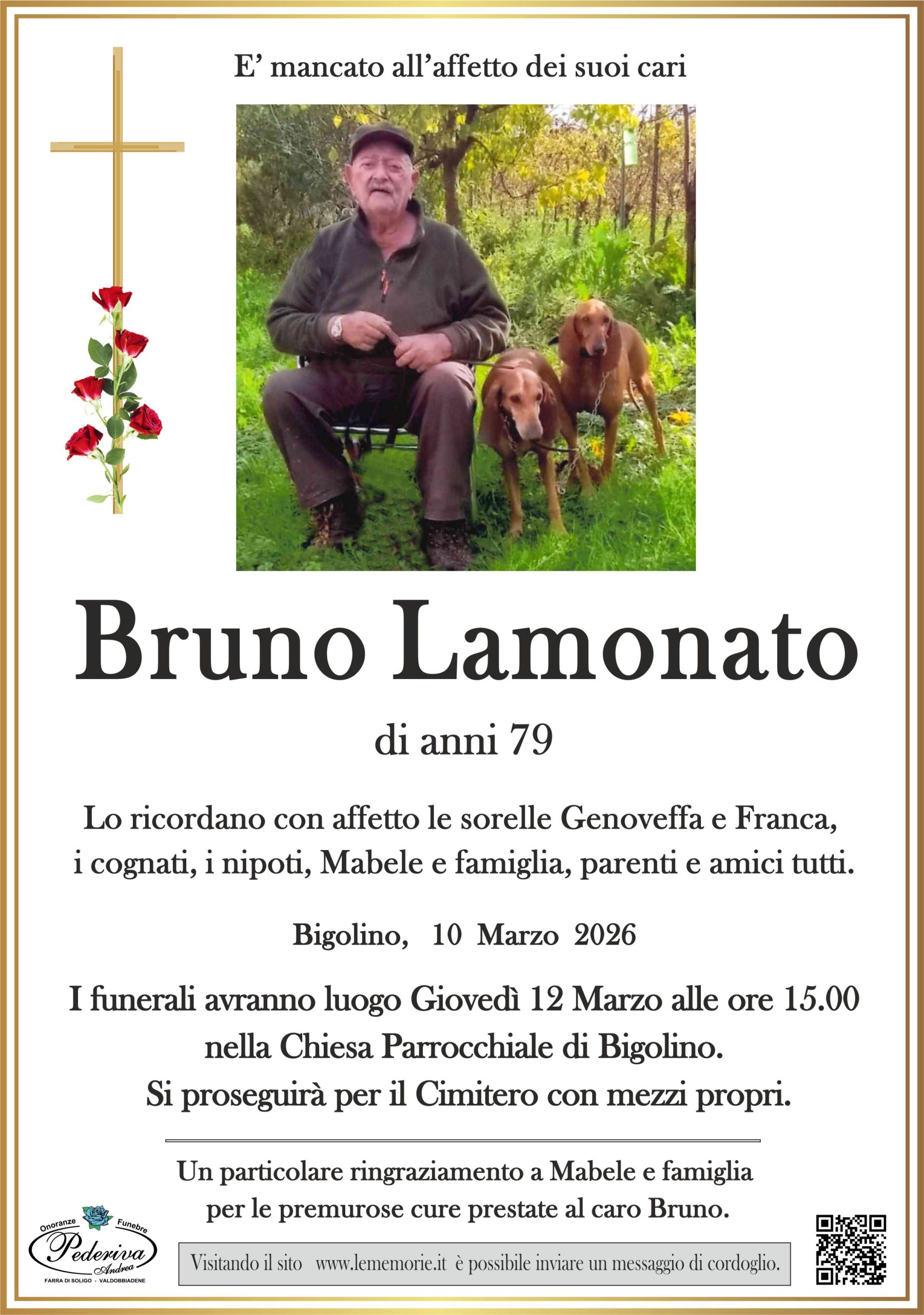 Un particolare ringraziamento a Mabele e famiglia per le premurose cure prestate al caro Bruno.