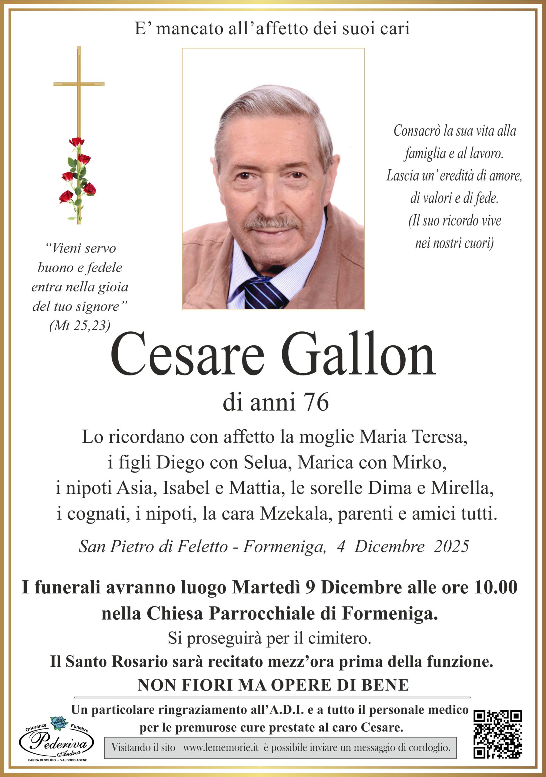 I funerali avranno luogo Martedì 9 Dicembre alle ore 10.00 nella Chiesa Parrocchiale di Formeniga.
