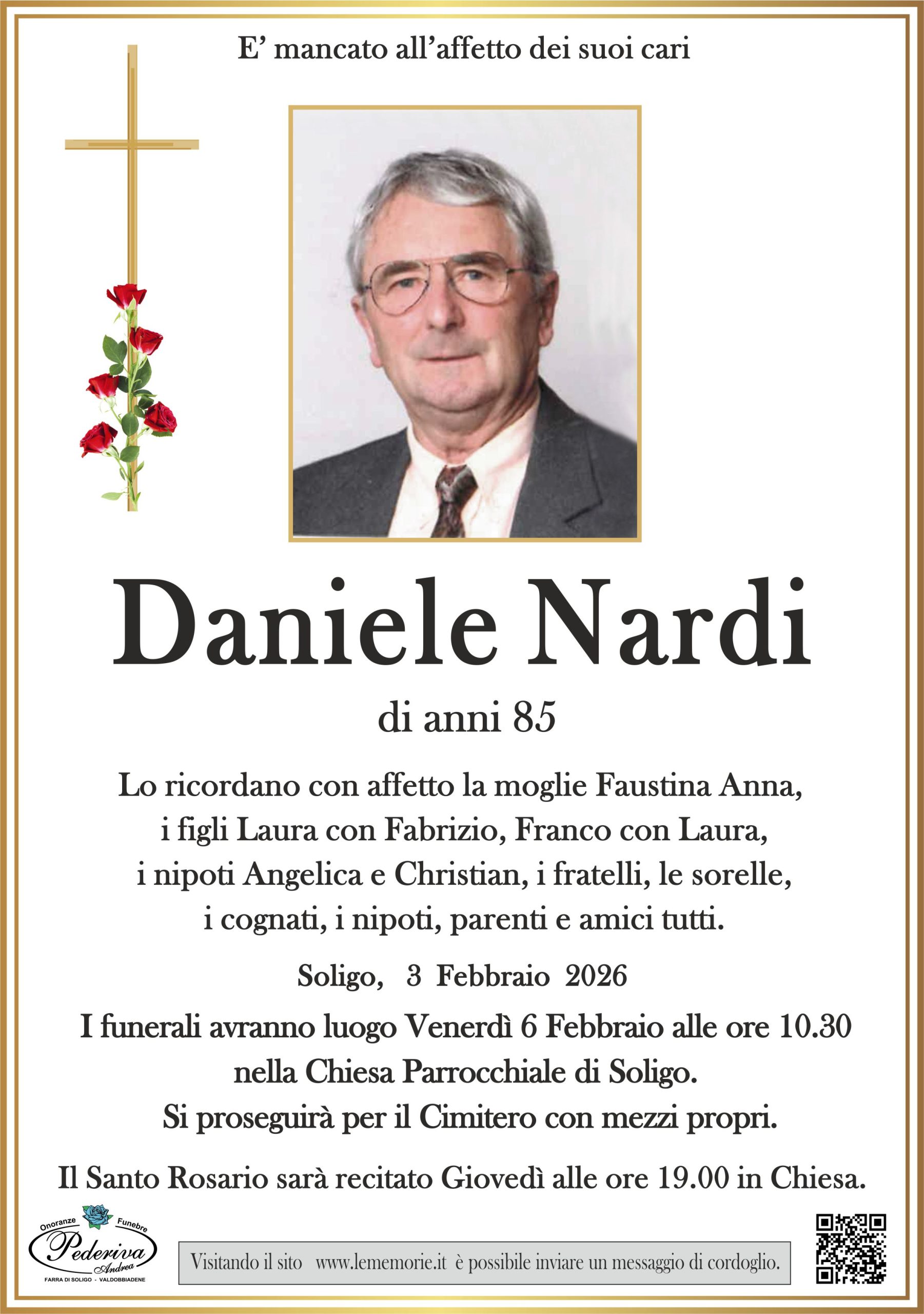 I funerali avranno luogo Venerdì 6 Febbraio alle ore 10.30 nella Chiesa Parrocchiale di Soligo.