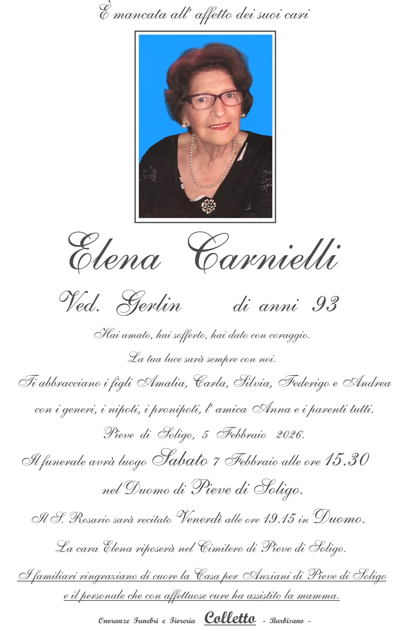 Il funerale avrà luogo Sabato 7 Febbraio alle ore 15.30 nel Duomo di Pieve di Soligo.