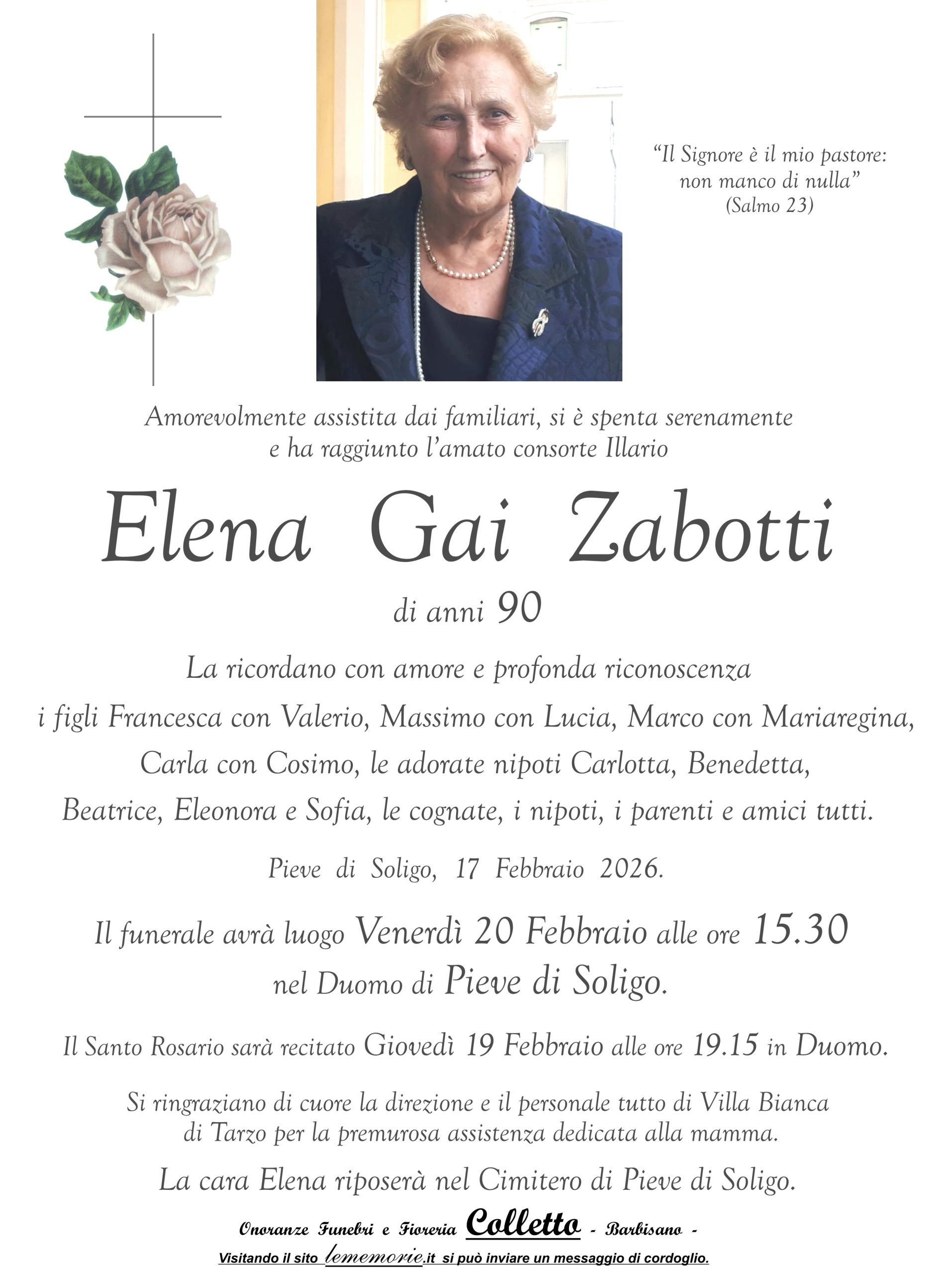 Il funerale avrà luogo Venerdì 20 Febbraio alle ore 15.30 nel Duomo di Pieve di Soligo.