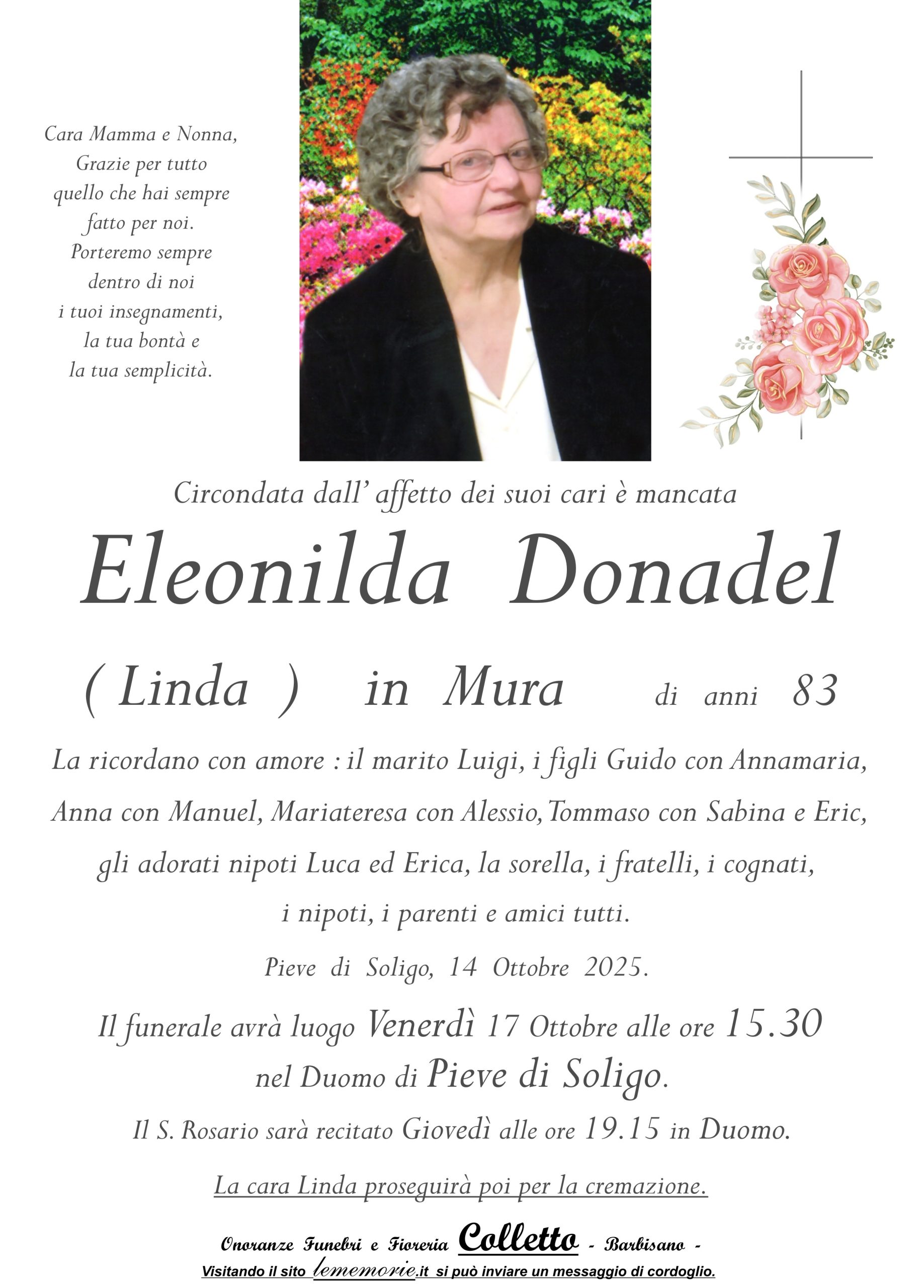 Il funerale avrà luogo Venerdì 17 Ottobre alle ore 15.30 nel Duomo di Pieve di Soligo.