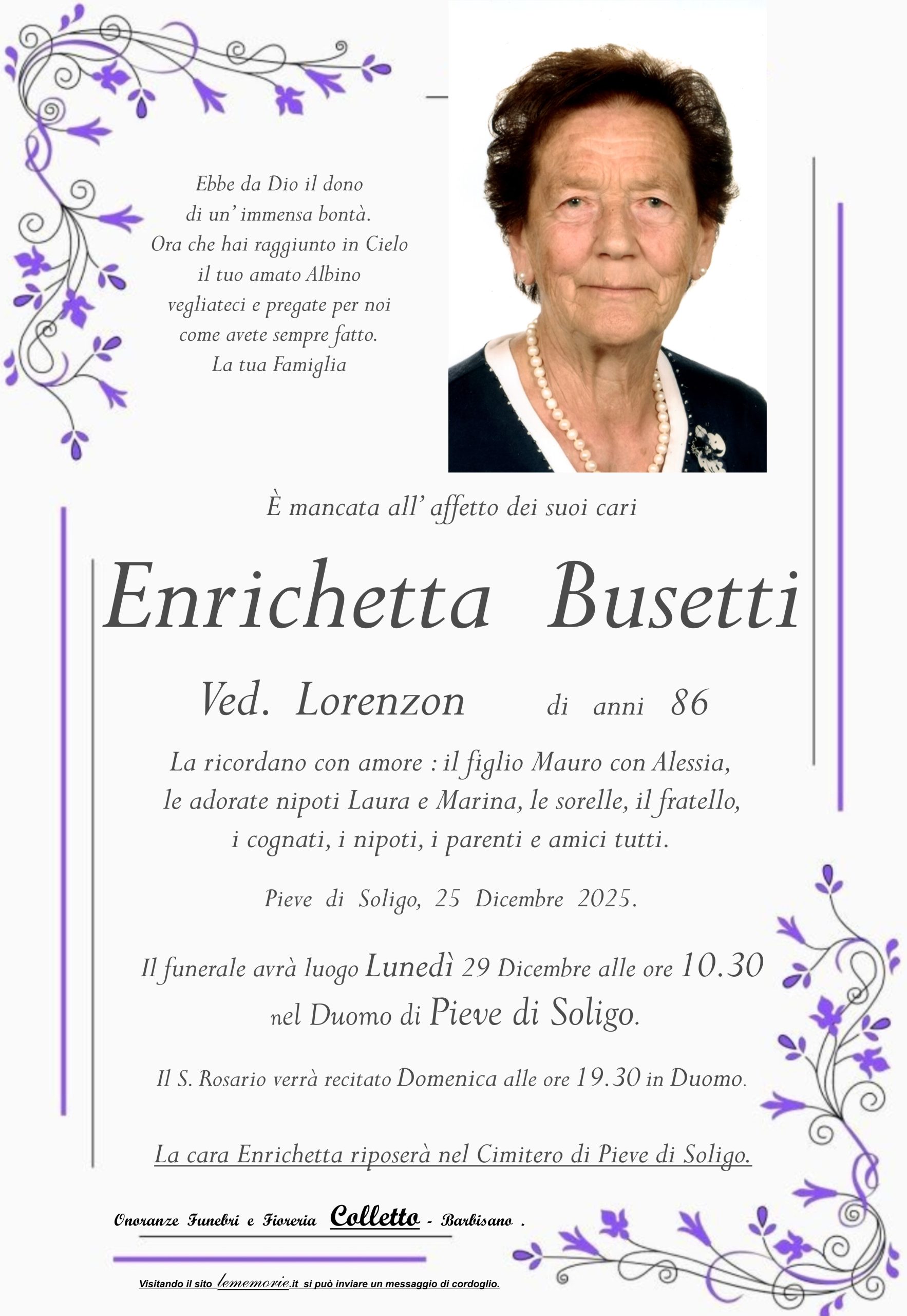La cara Enrichetta riposerà nel Cimitero di Pieve di Soligo.