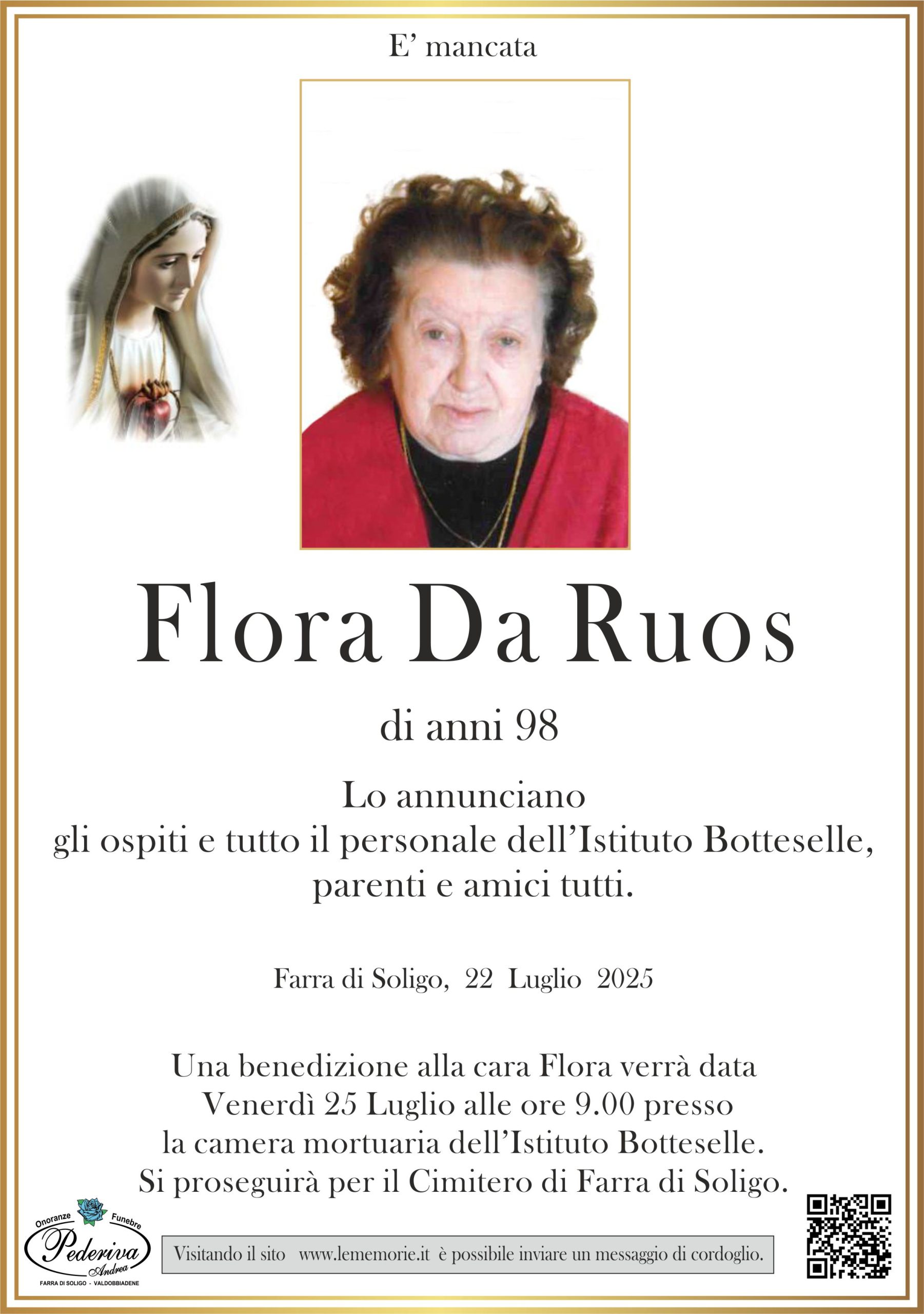 Una benedizione alla cara Flora verrà data Venerdì 25 Luglio alle ore 9.00 presso la camera mortuaria dell’Istituto Botteselle.