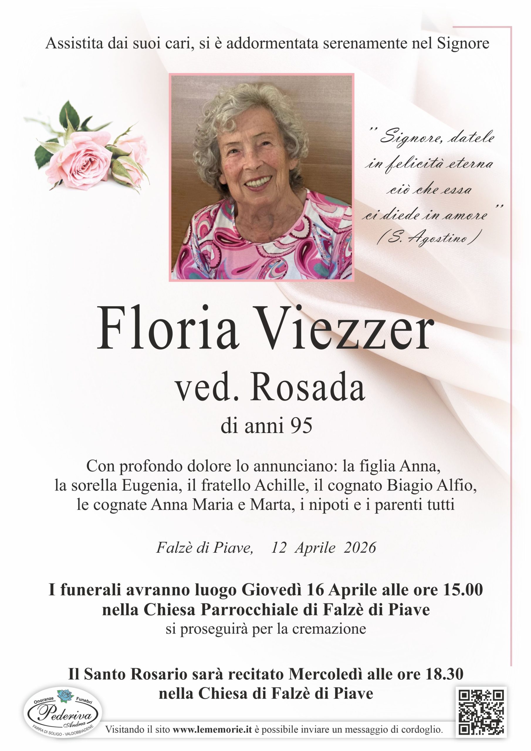 I funerali avranno luogo Giovedì 16 Aprile alle ore 15.00 nella Chiesa Parrocchiale di Falzè di Piave