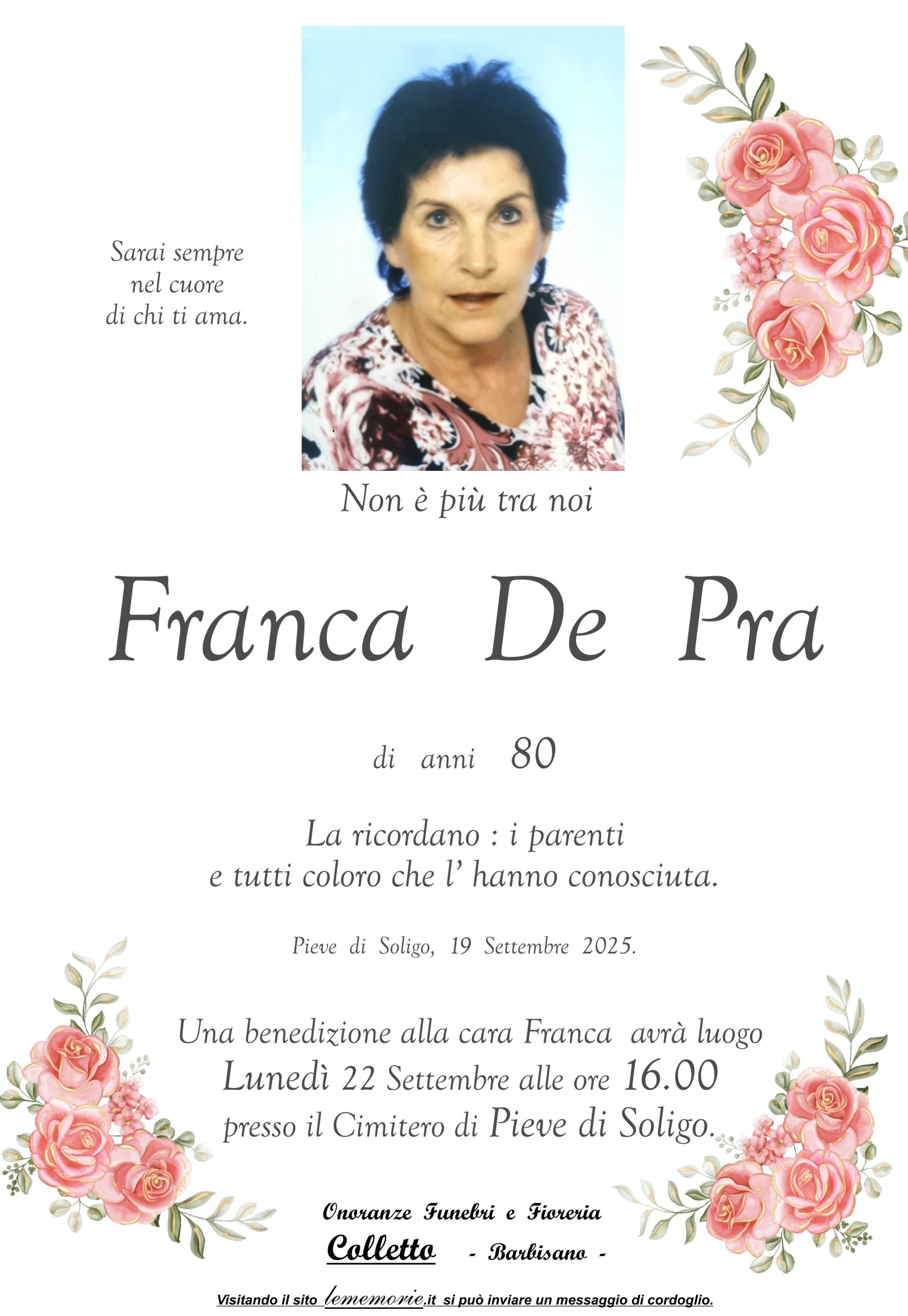 Una benedizione alla cara Franca avrà luogo Lunedi 22 Settembre alle ore 16.00 presso il Cimitero di Pieve di Soligo.