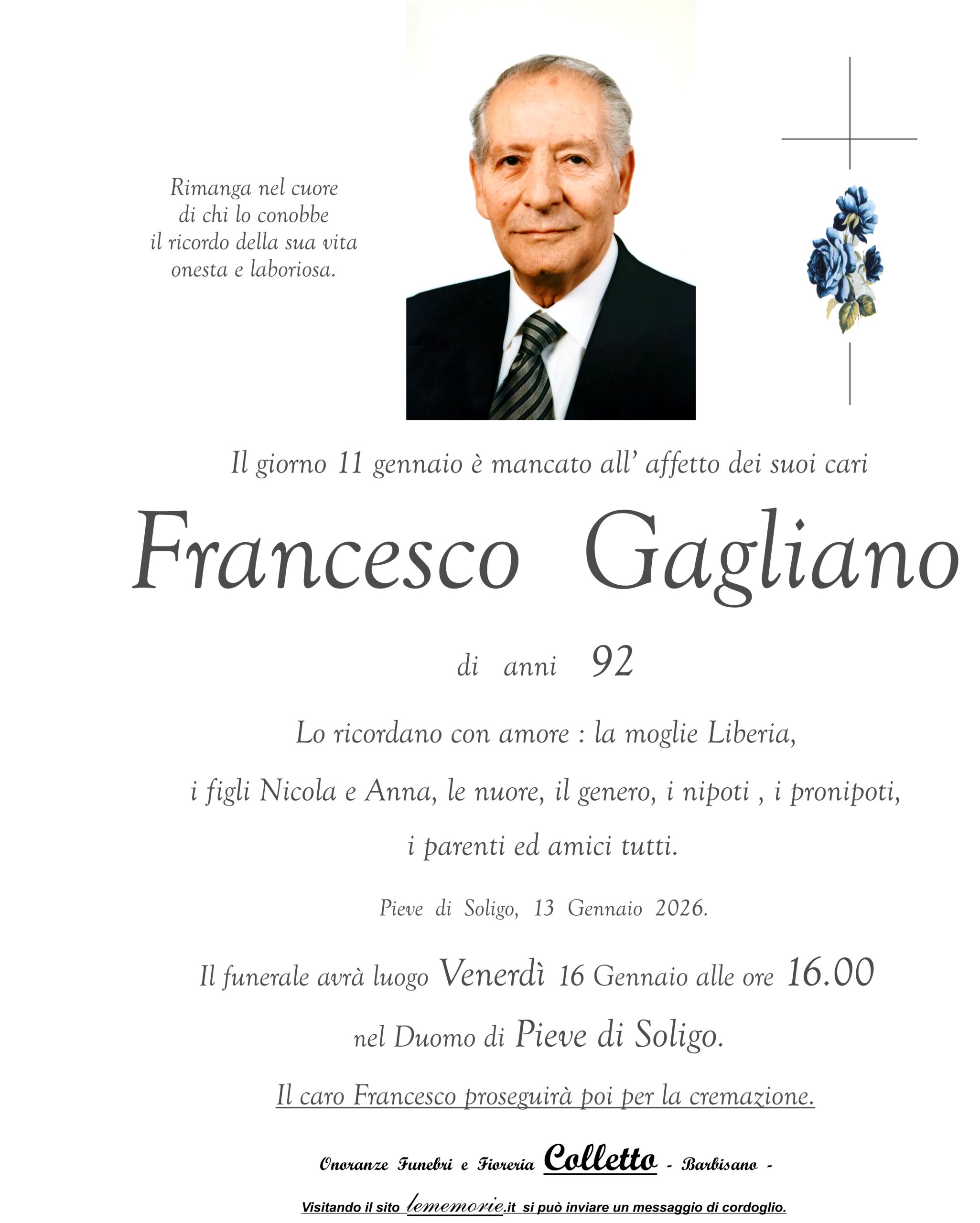 Il funerale avrà luogo Venerdì 16 Gennaio alle ore 16.00 nel Duomo di Pieve di Soligo.