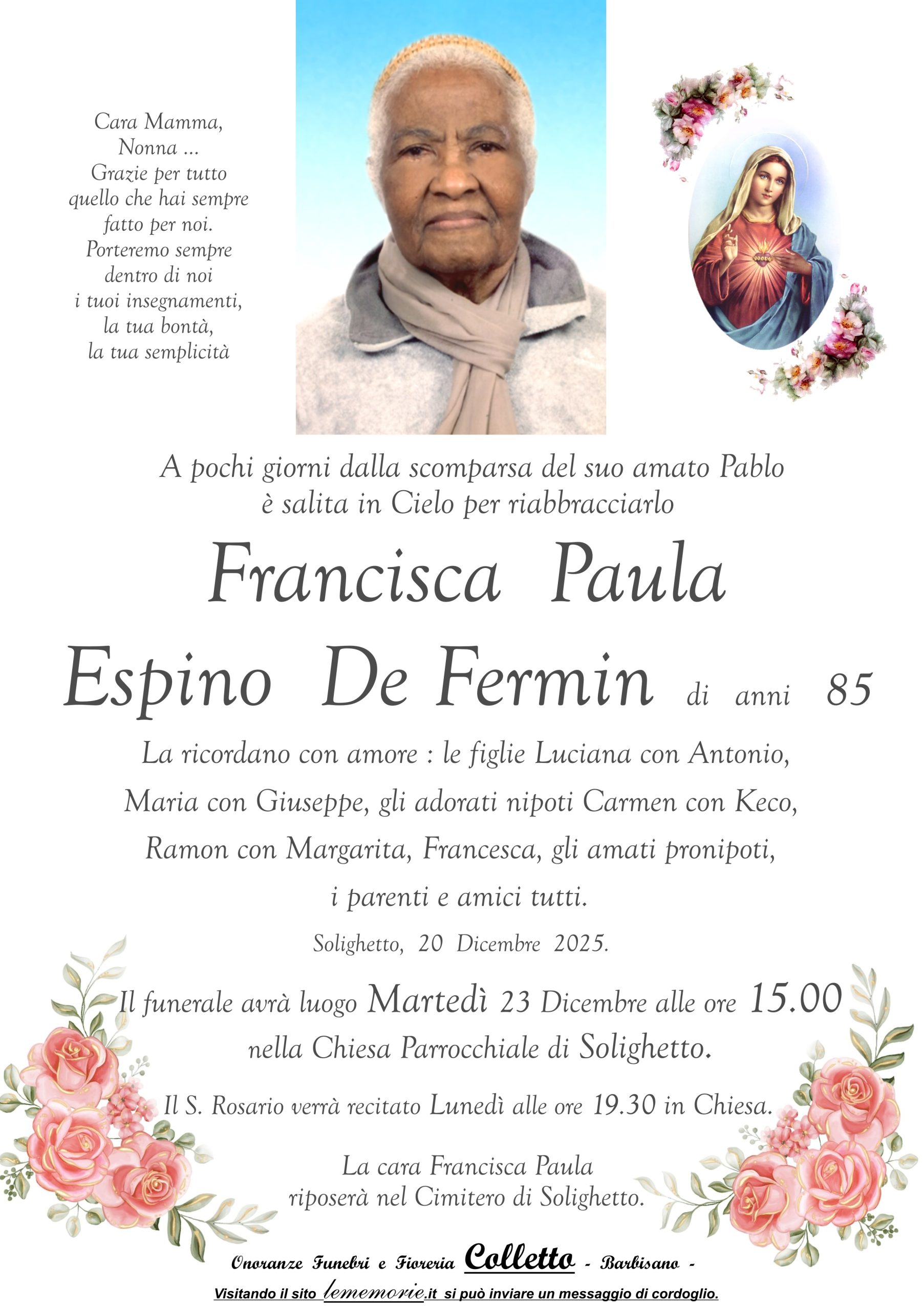 La cara Francisca Paula riposerà nel Cimitero di Solighetto.