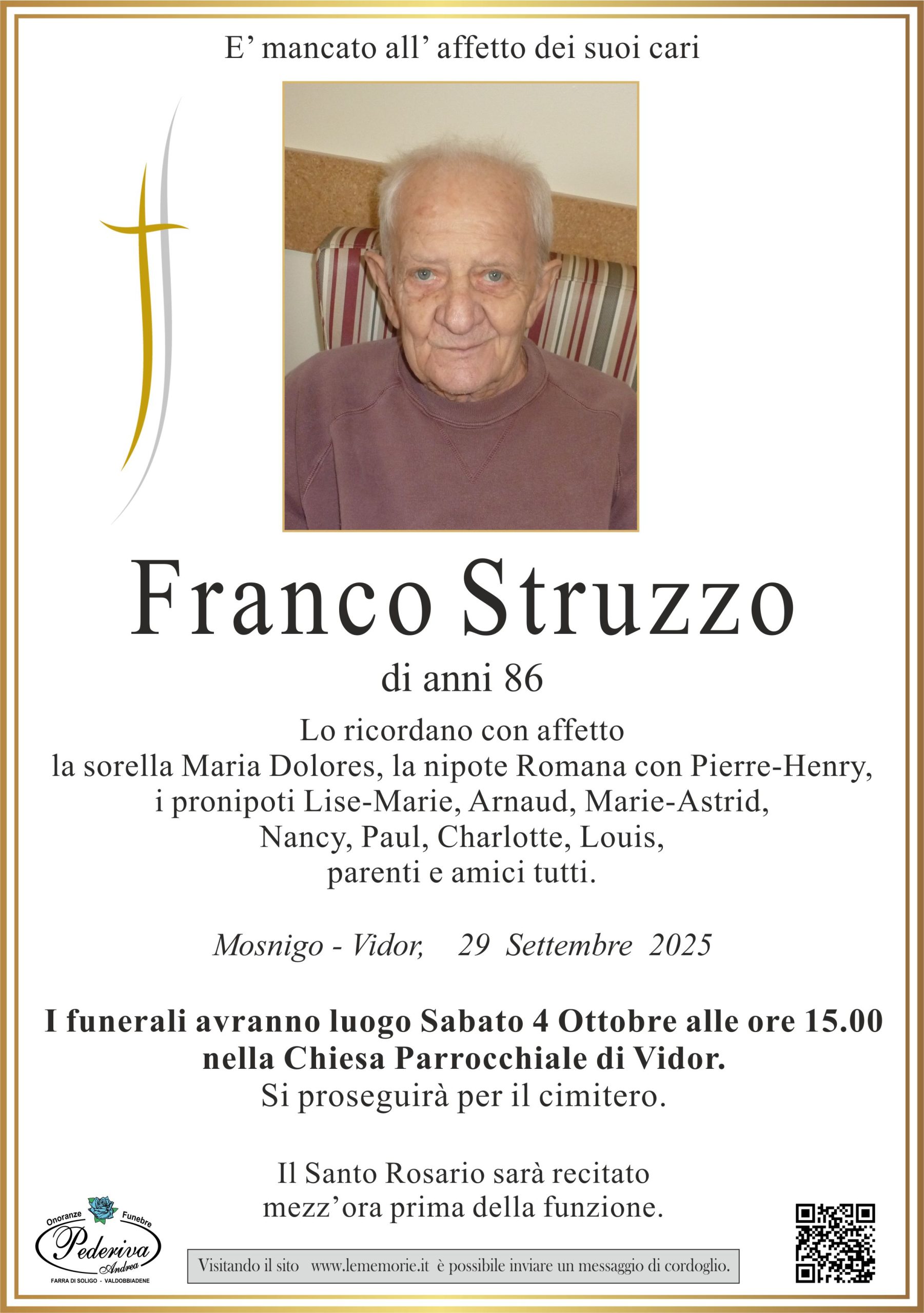I funerali avranno luogo Sabato 4 Ottobre alle ore 15.00 nella Chiesa Parrocchiale di Vidor.