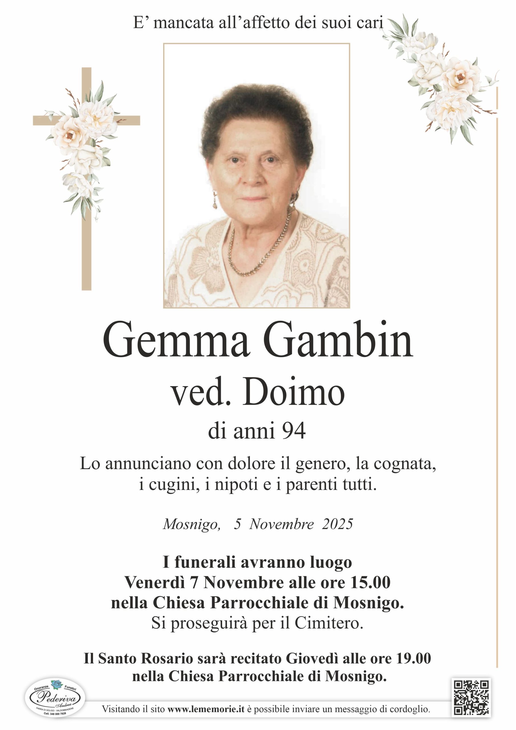 I funerali avranno luogo Venerdì 7 Novembre alle ore 15.00 nella Chiesa Parrocchiale di Mosnigo.