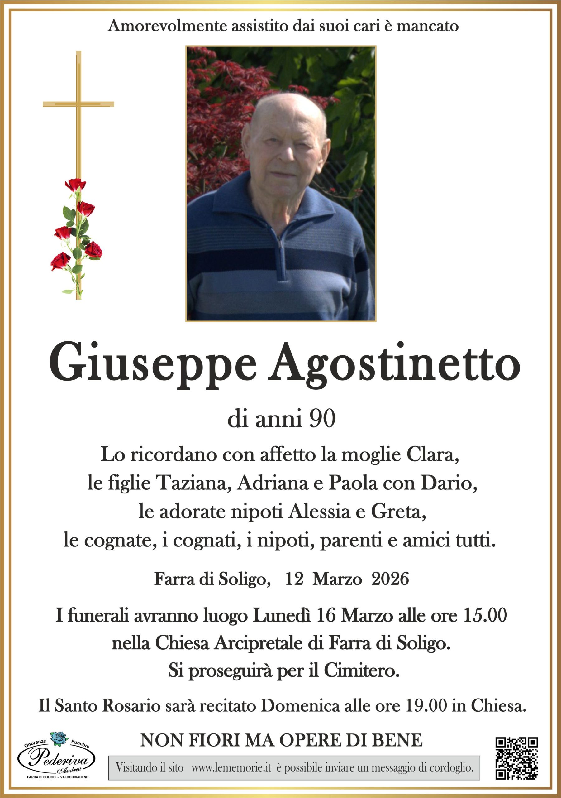 I funerali avranno luogo Lunedì 16 Marzo alle ore 15.00 nella Chiesa Arcipretale di Farra di Soligo.