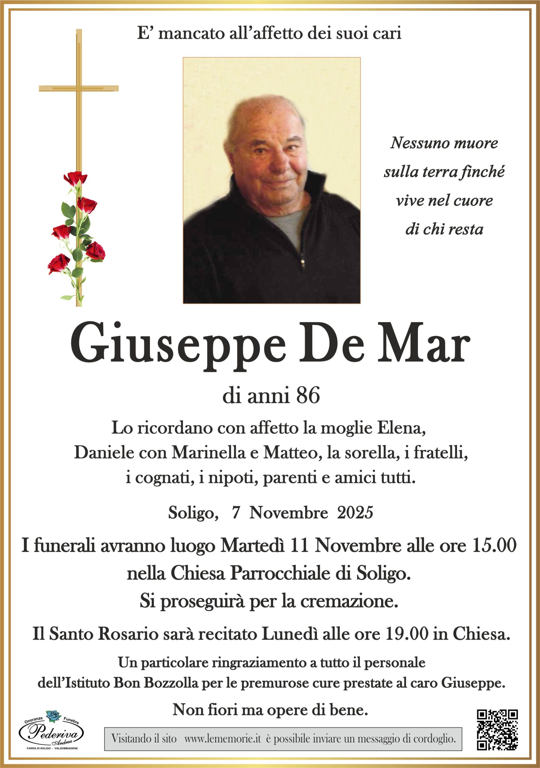 I funerali avranno luogo Martedì 11 Novembre alle ore 15.00 nella Chiesa Parrocchiale di Soligo.