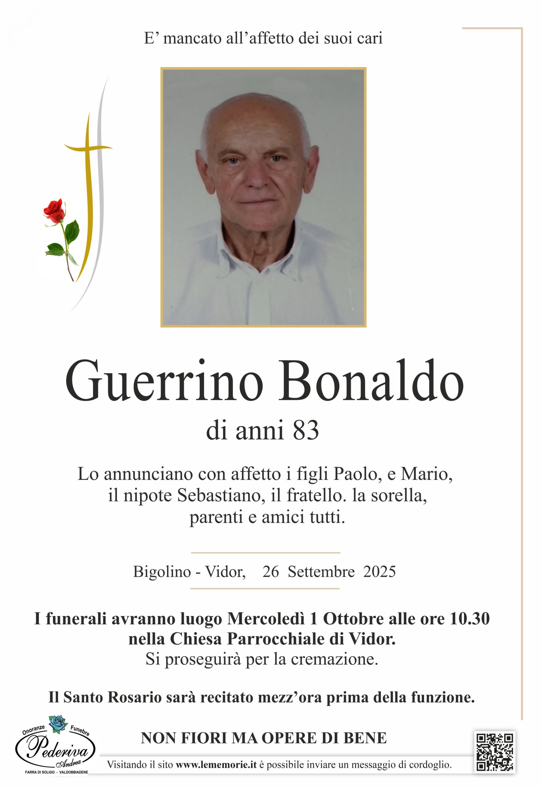 I funerali avranno luogo Mercoledì 1 Ottobre alle ore 10.30 nella Chiesa Parrocchiale di Vidor.