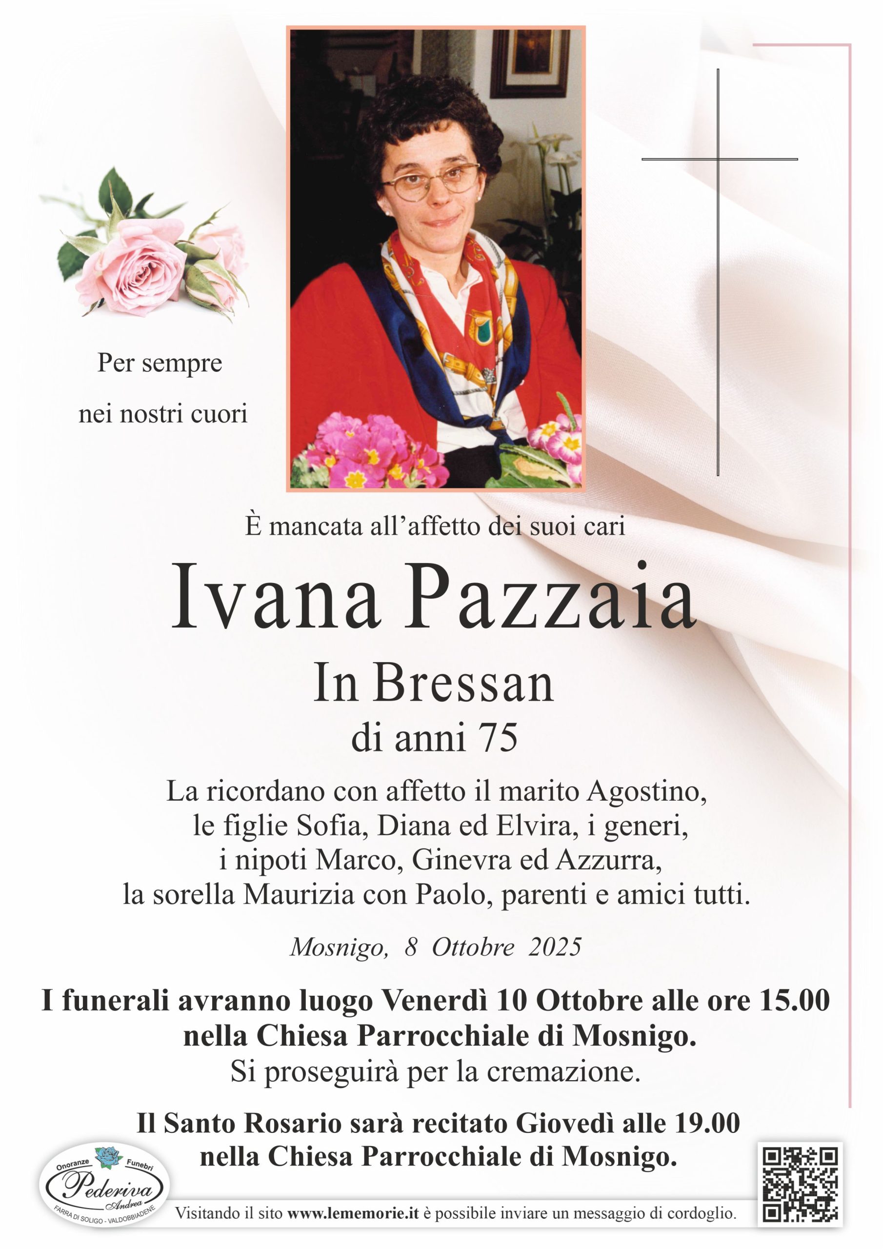 I funerali avranno luogo Venerdì 10 Ottobre alle ore 15.00 nella Chiesa Parrocchiale di Mosnigo.