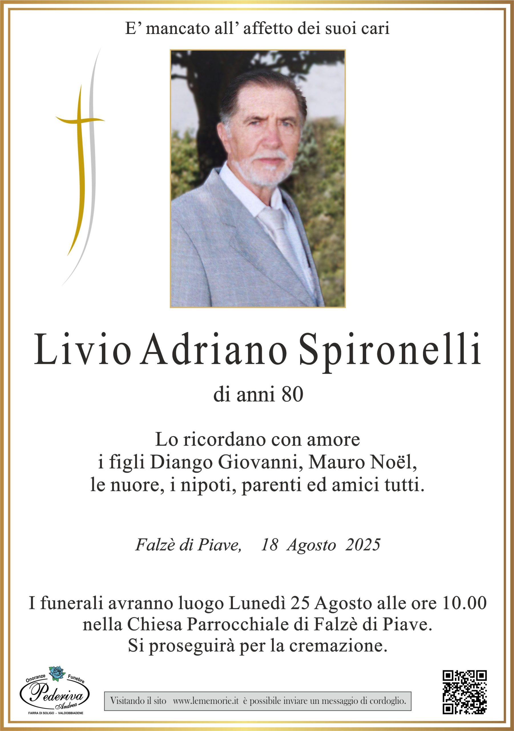 I funerali avranno luogo Lunedì 25 Agosto alle ore 10.00 nella Chiesa Parrocchiale di Falzè di Piave.