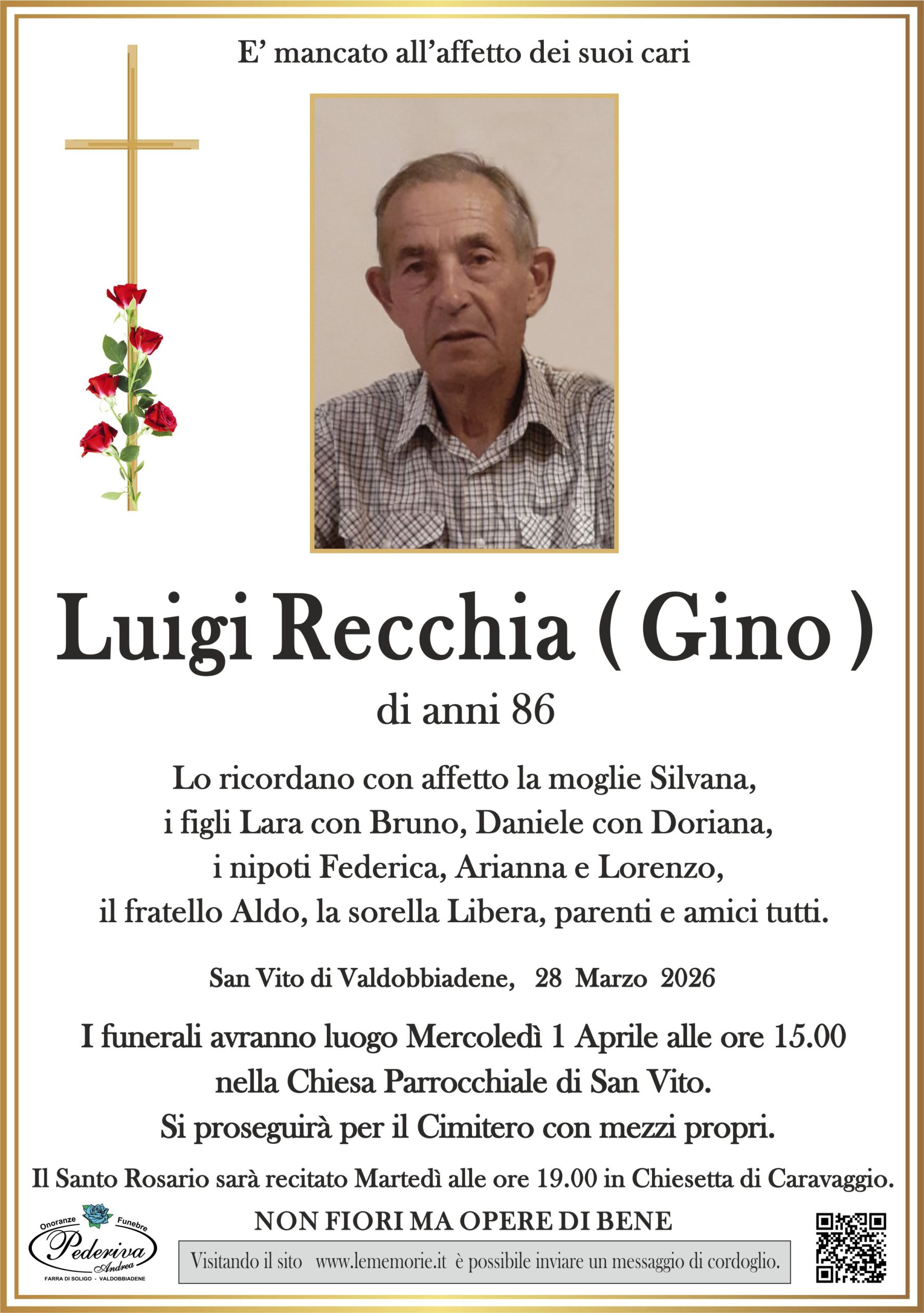 I funerali avranno luogo Mercoledì 1 Aprile alle ore 15.00 nella Chiesa Parrocchiale di San Vito.