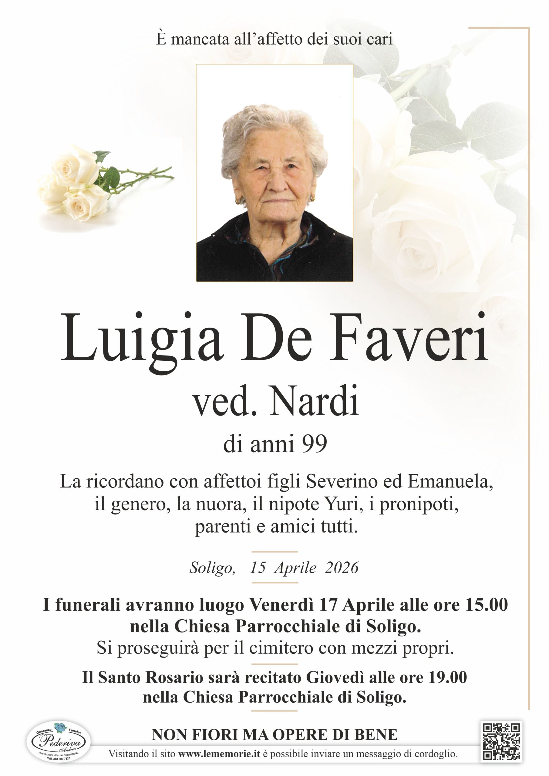 I funerali avranno luogo Venerdì 17 Aprile alle ore 15.00 nella Chiesa Parrocchiale di Soligo.