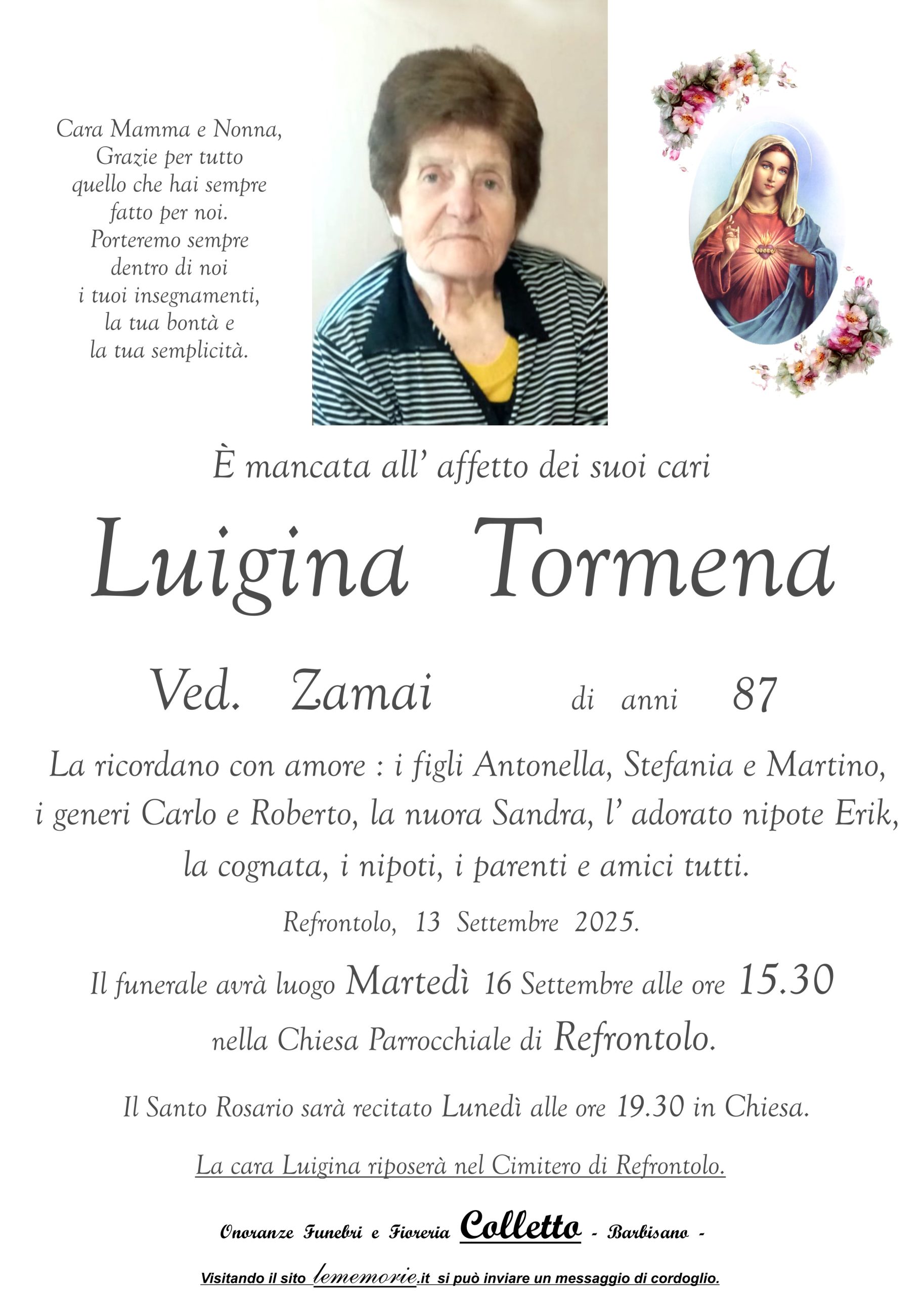 Il funerale avrà luogo Martedi 16 Settembre alle ore 15.30 nella Chiesa Parrocchiale di Refrontolo.