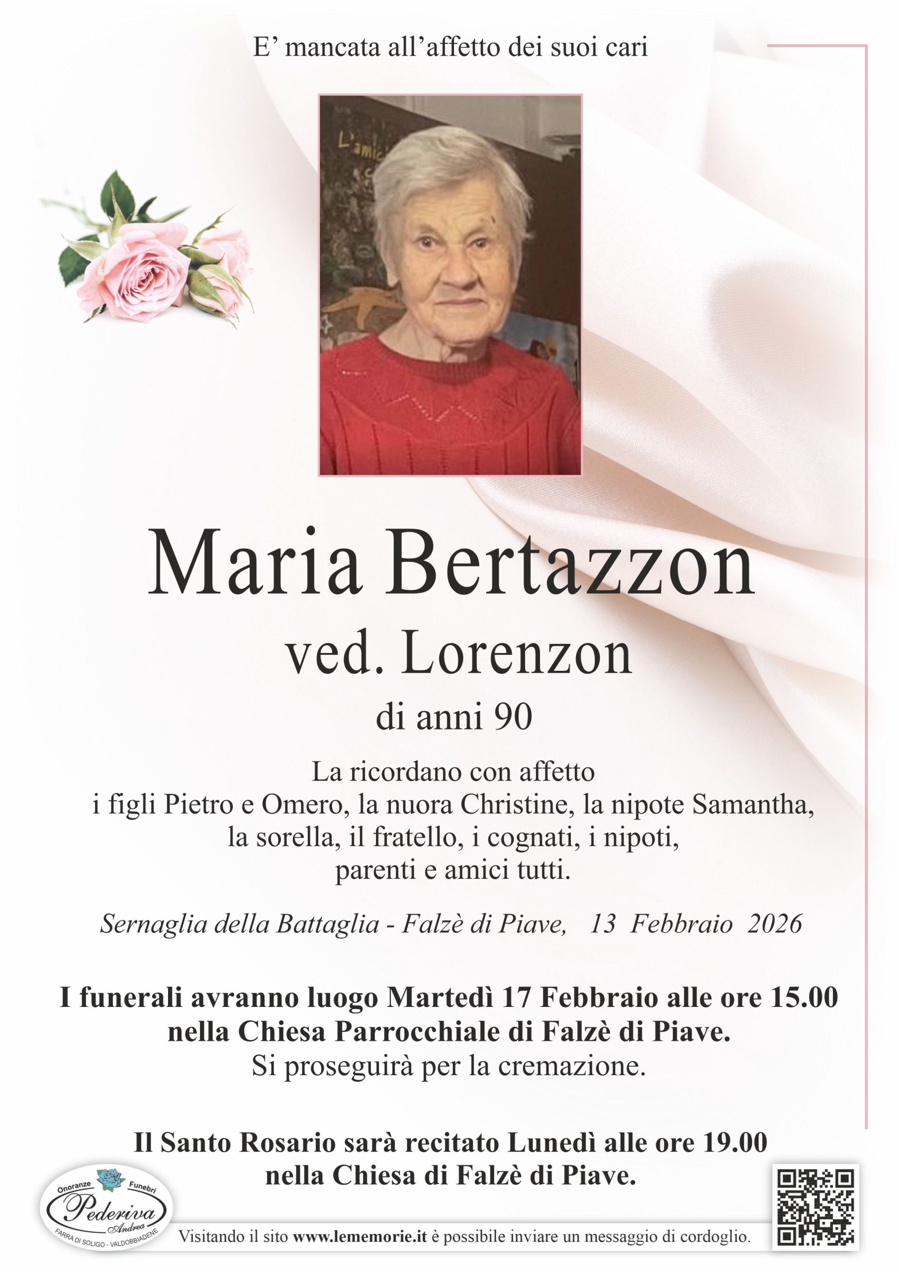 I funerali avranno luogo Martedì 17 Febbraio alle ore 15.00 nella Chiesa Parrocchiale di Falzè di Piave.