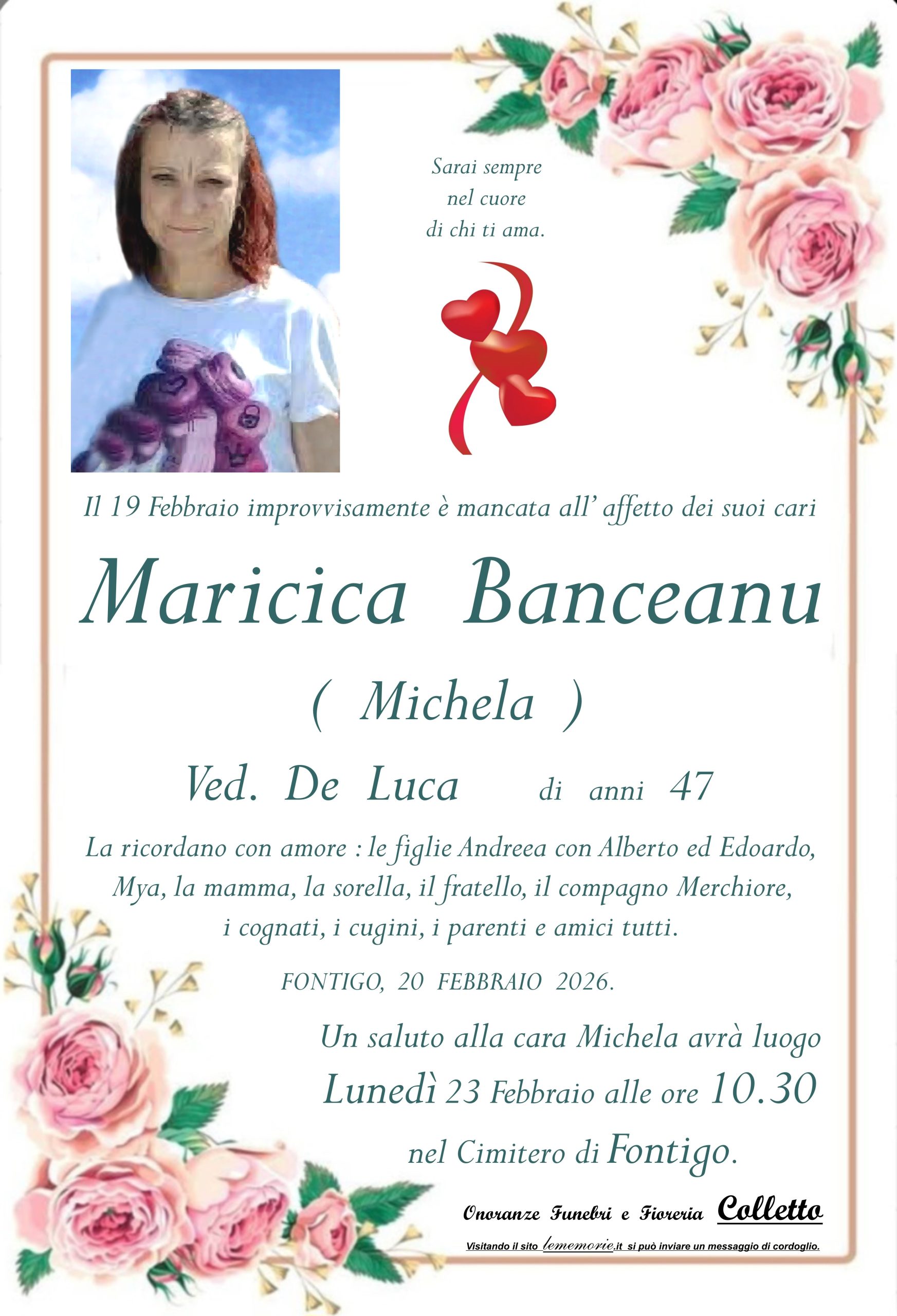 La ricordano con amore : le figlie Andreea con Alberto ed Edoardo, Mya, la mamma, la sorella, il fratello, il compagno Merchiore, i cognati, i cugini, i parenti e amici tutti.