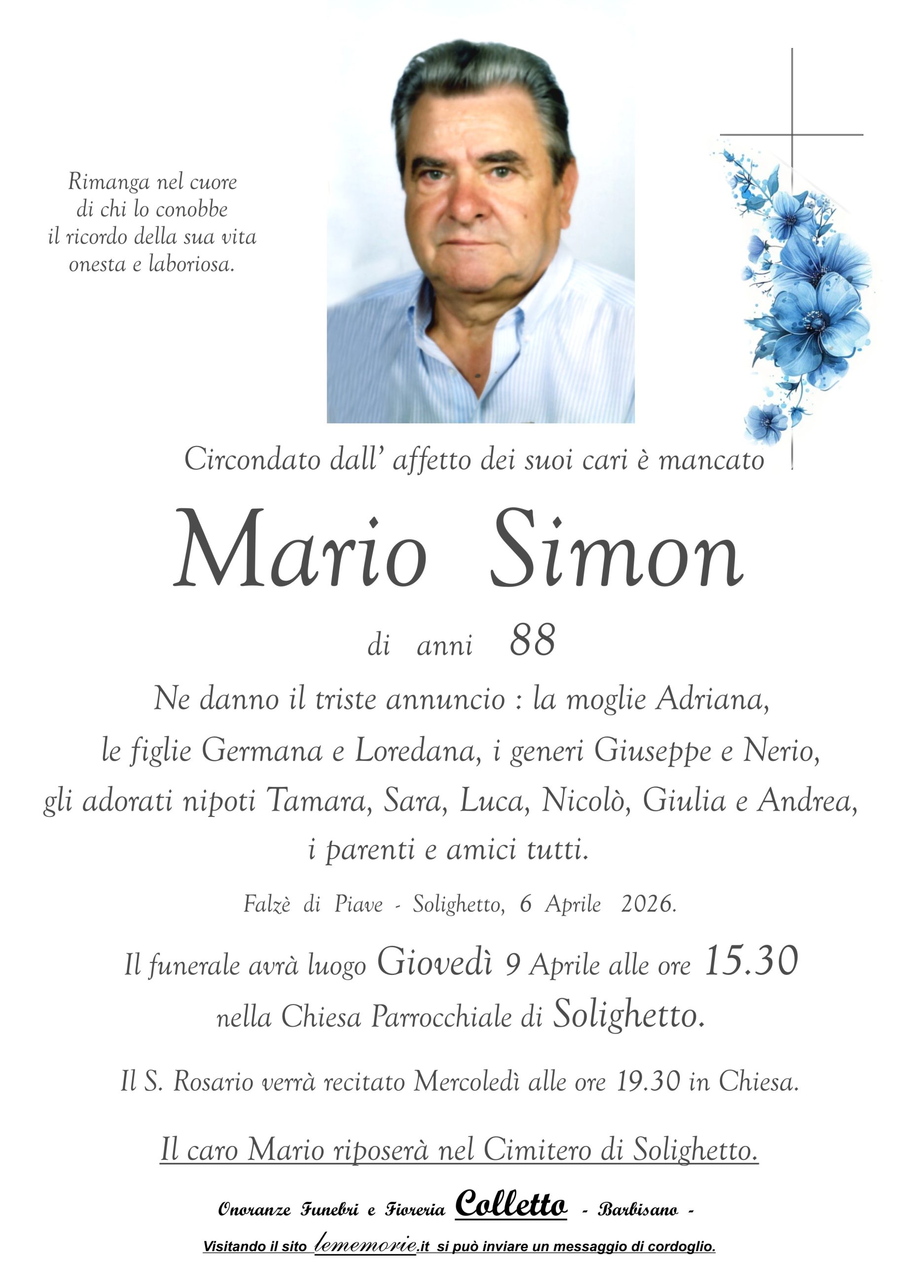 Il funerale avrà luogo Giovedì 9 Aprile alle ore 15.30 nella Chiesa Parrocchiale di Solighetto.
