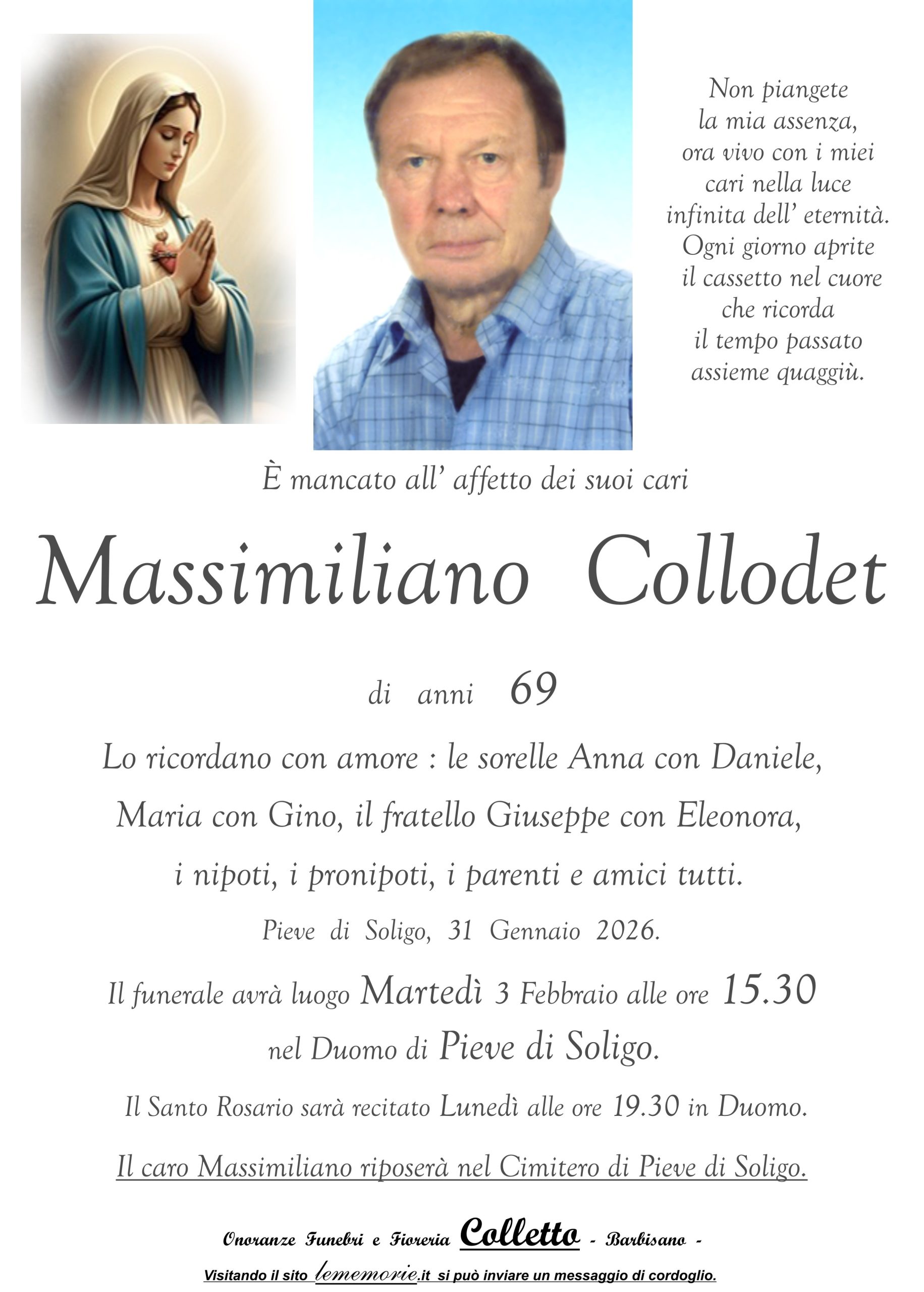 Il funerale avrà luogo Martedì 3 Febbraio alle ore 15.30 nel Duomo di Pieve di Soligo.