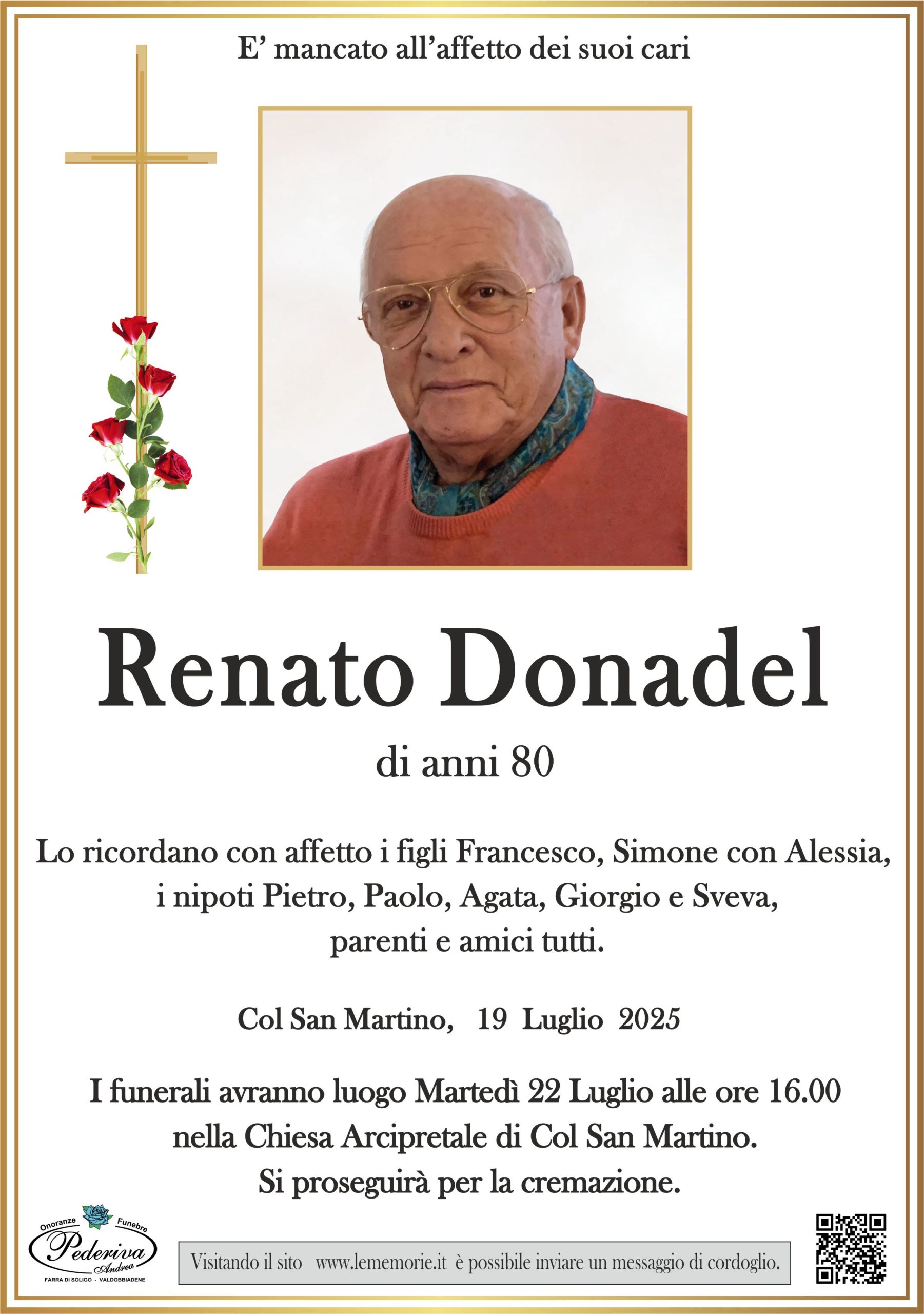 I funerali avranno luogo Martedì 22 Luglio alle ore 16.00 nella Chiesa Arcipretale di Col San Martino.
