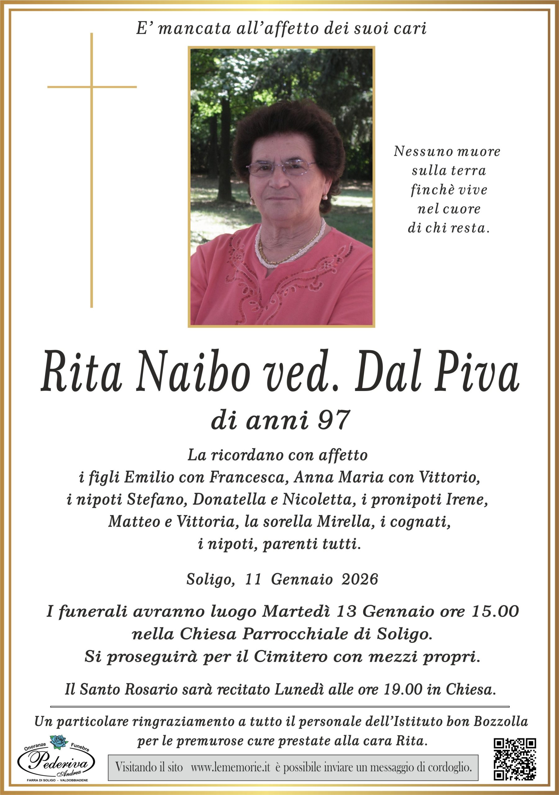 I funerali avranno luogo Martedì 13 Gennaio ore 15.00 nella Chiesa Parrocchiale di Soligo.
