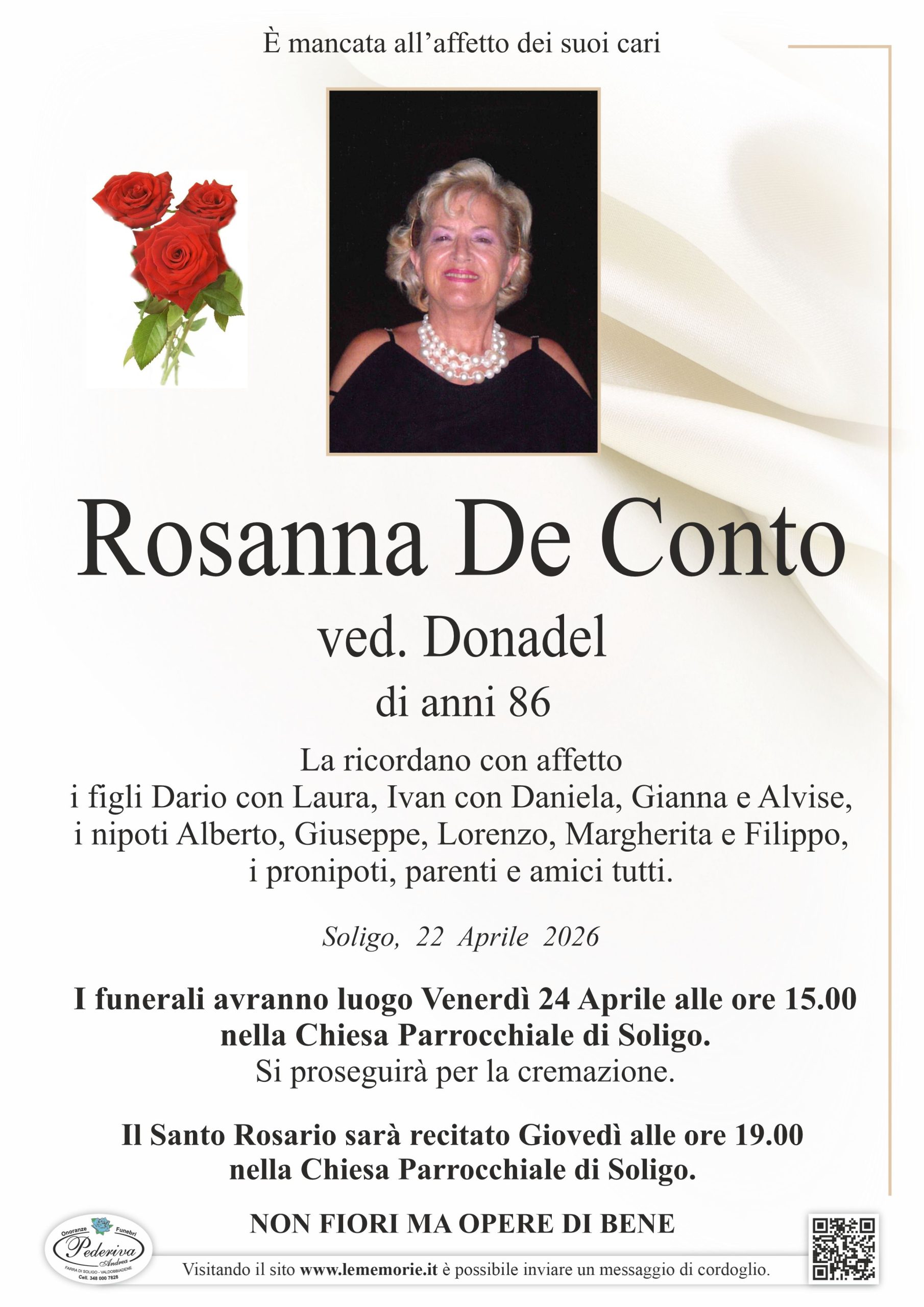 I funerali avranno luogo Venerdì 24 Aprile alle ore 15.00 nella Chiesa Parrocchiale di Soligo.