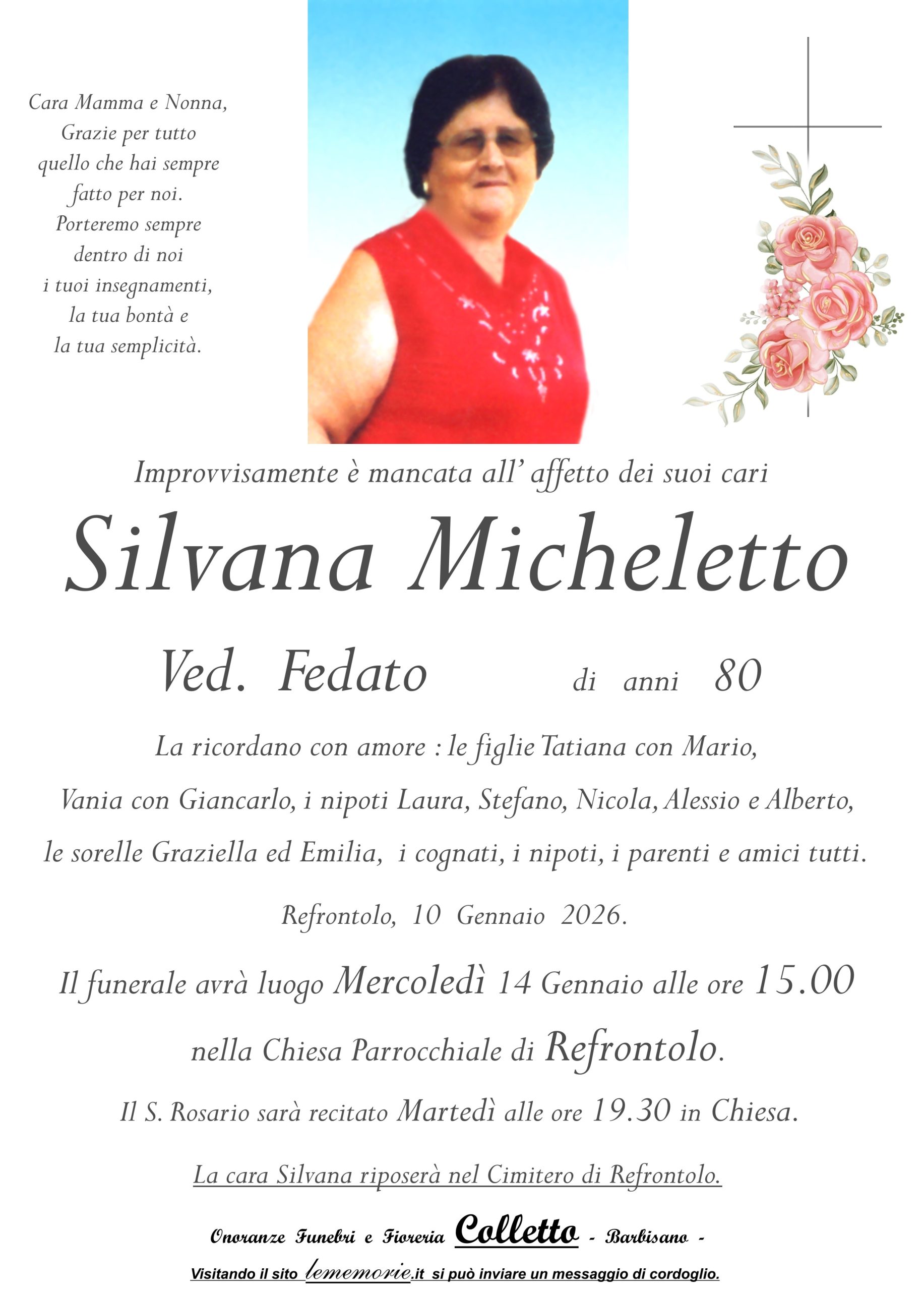 Il funerale avrà luogo Mercoledì 14 Gennaio alle ore 15.00 nella Chiesa Parrocchiale di Refrontolo.