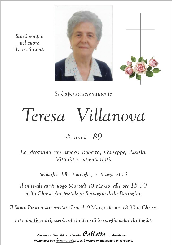 Il funerale avrà luogo Martedi 10 Marzo alle ore 15.30 nella Chiesa Arcipretale di Sernaglia della Battaglia.