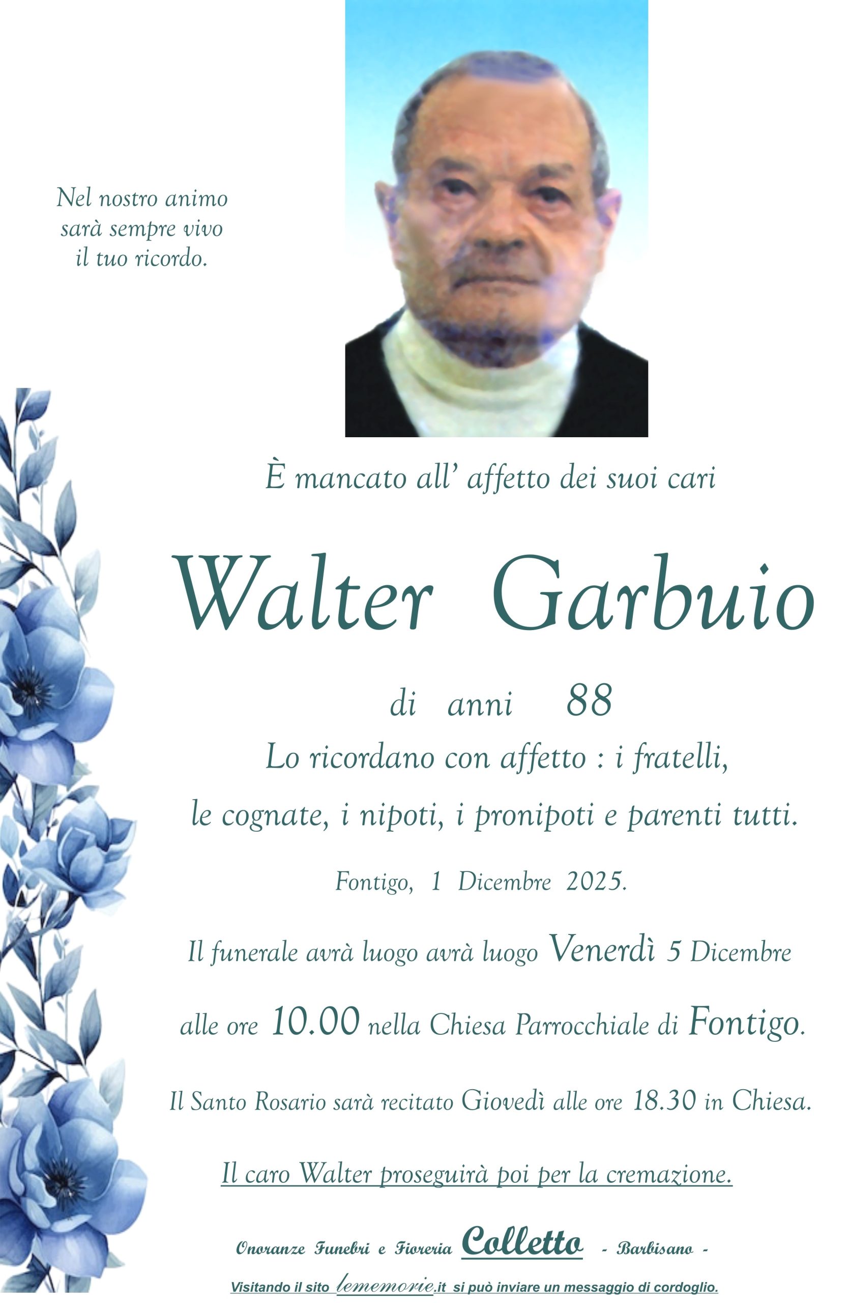 Il funerale avrà luogo avrà luogo Venerdì 5 Dicembre alle ore 10.00 nella Chiesa Parrocchiale di Fontigo.